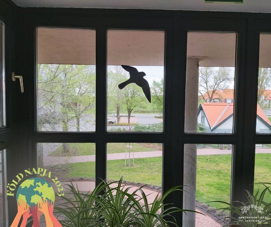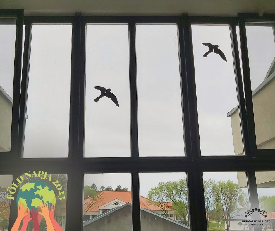 Negyedik nap: Intézményünknek fontos a madarak védelme. Épületeink nagy üvegfelületekkel rendelkeznek, így több helyen fekete madár alakú matricákkal kerüljük el, hogy a madarak nekirepüljenek.