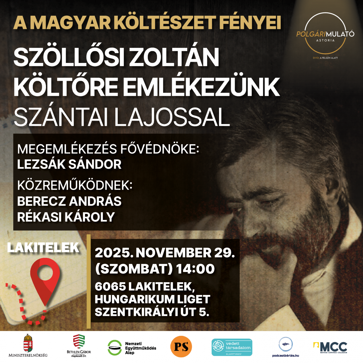 Emlékest és „költői hangverseny” Szöllősi Zoltán (1945-2018) József Attila-díjas magyar költő és műfordító emlékére Szántai Lajos neves művelődéskutatóval, aki arra emlékeztet, hogy a költészet, akárcsak a néphagyomány, a magyarság mélyebb, szakrális üzeneteit hordozza magában, melyek a szívhez szólnak, és segítenek megérteni nemzeti identitásunkat.