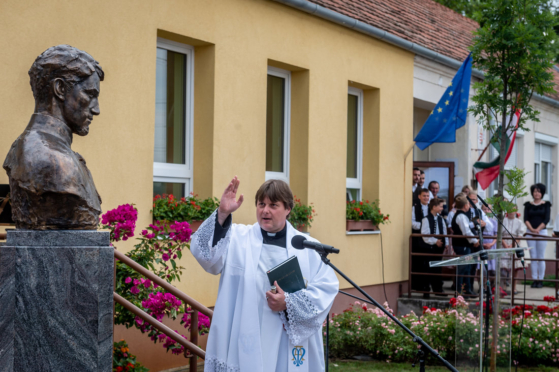 Á. Fúrús János, Csólyospálos polgármestere a település közössége nevében mondott köszöntet, hogy Lezsák Sándor ajándékaként felavathatták a könyvtár előtt Lantos Györgyi szobrászművész alkotását. A falu vezetője köszönetet mondott az ünnepi műsor összeállítóinak is, mert szinte minden csólyospálosi csoport kapott néhány percet ezen az ünnepnapon és bemutathatta tudását. A szobrot Gál József plébános szentelte fel.