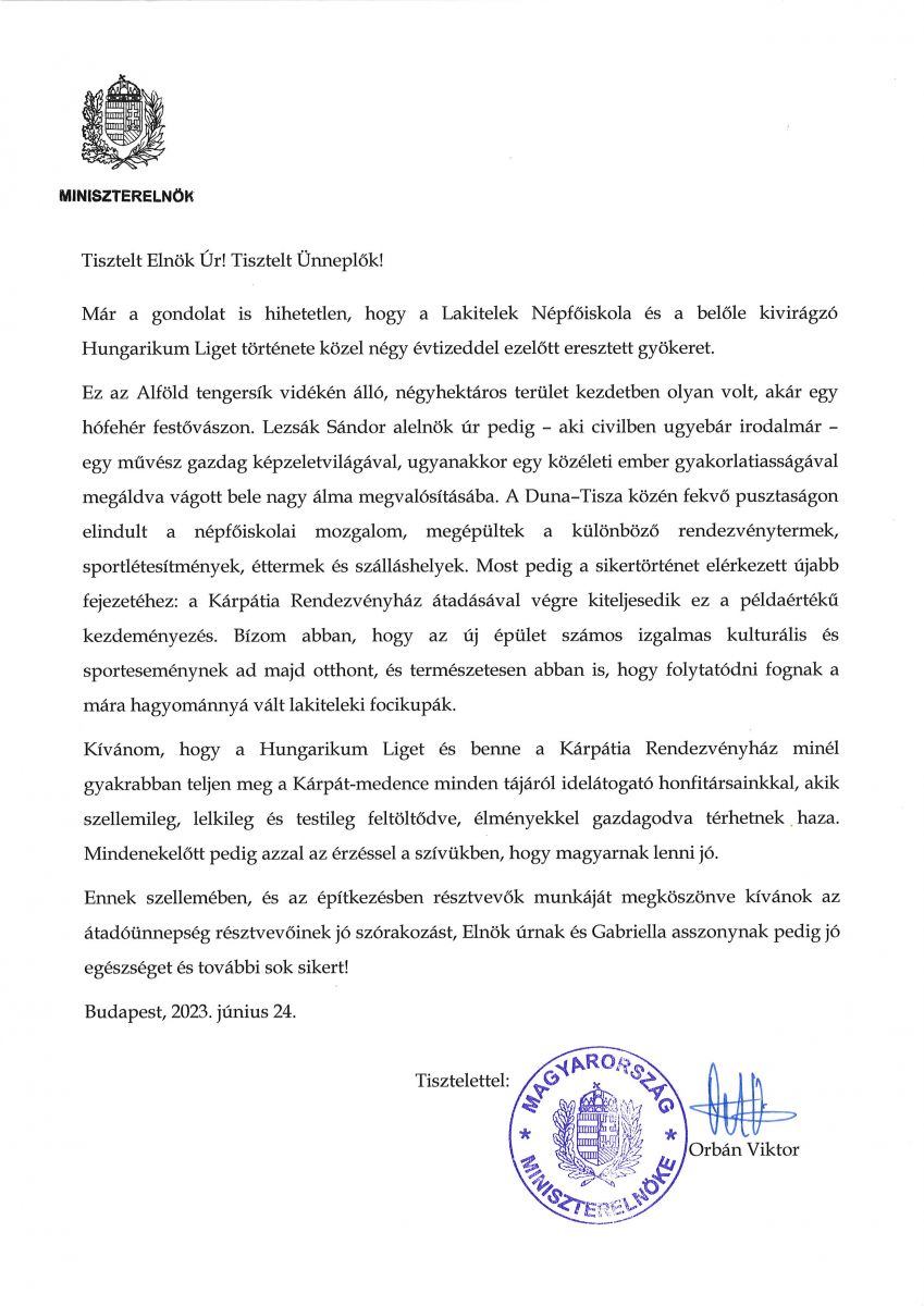 Orbán Viktor miniszterelnök levélben fejezte ki jókívánságait. Üzenetében úgy fogalmazott: "a Lakitelek Népfőiskola és a belőle kivirágzó Hungarikum Liget története közel négy évtizeddel ezelőtt eresztett gyökeret", a Duna-Tisza közén fekvő pusztaságon elindult a népfőiskolai mozgalom, megépültek a különböző rendezvénytermek, sportlétesítmények, éttermek és szálláshelyek. Most pedig a sikertörténet elérkezett újabb fejezetéhez. A Kárpátia Rendezvényház átadásával "végre kiteljesedik ez a példaértékű kezdeményezés" - írta a kormányfő.