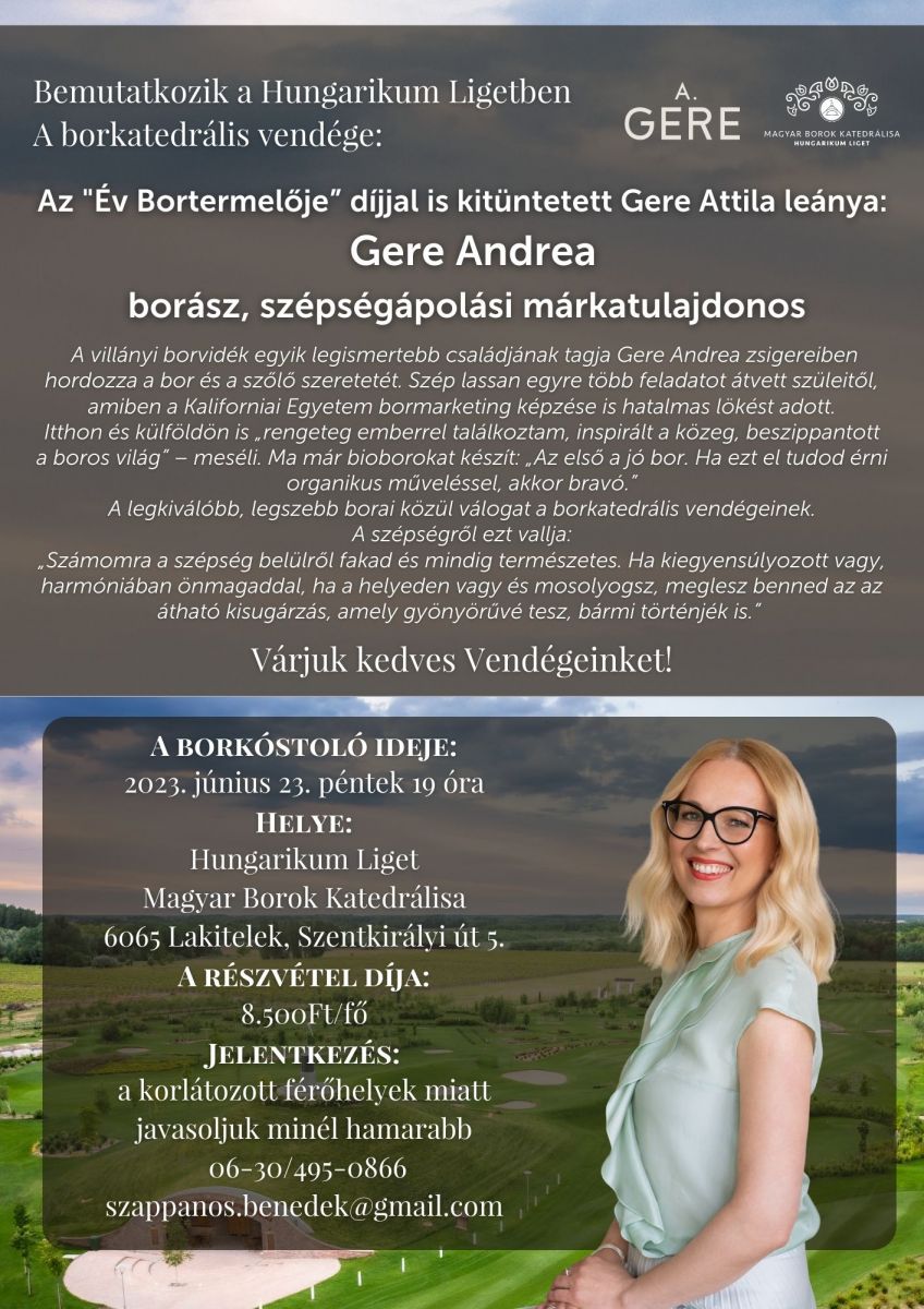 Szeretettel várjuk kedves Vendégeinket június 23-án a Magyar Borok Katedrálisában tartandó borestre, ahol bemutatkozik az "Év Bortermelője” díjjal is kitüntetett Gere Attila leánya: Gere Andrea, borász, szépségápolási márkatulajdonos.