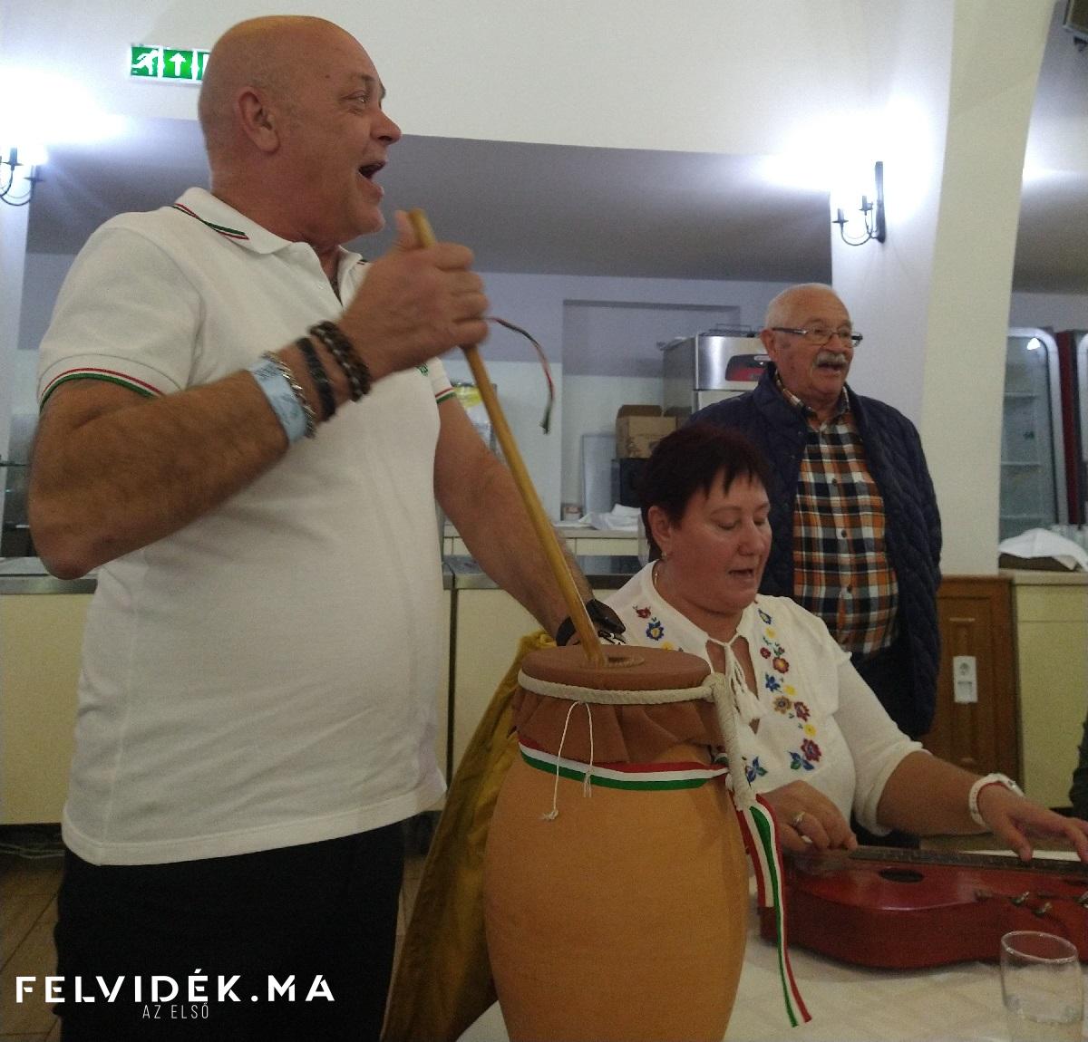 Természetesen az esti öröméneklés sem maradhatott el. Előkerültek a népi hangszerek, a gyenesdiási citera, tárogató mellett a harmonika, a felsőszeliek közül Kubovics Alica citerázott, Földi Tibor pedig köcsögdudán tartotta a ritmust a népdalok és magyar nóták megszólaltatásakor. Csodálatos érzés volt, hogy az egymástól elszakított területek dalosai a zene hangjain egyek lettek ezen az estén.
