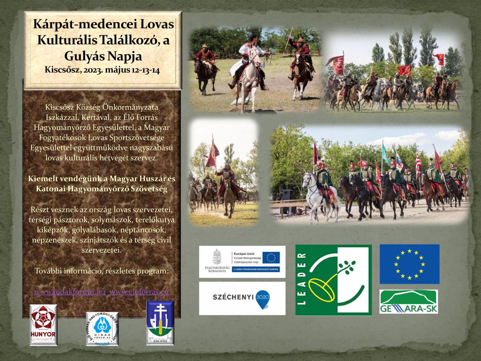 Az Élő Forrás Hagyományőrző Egyesület és Kiscsősz Község Önkormányzata egy különleges lovas rendezvényt tervez május 12-13-14-ére, melyben a Magyar Huszár és Katonai Hagyományőrző Szövetség az együttműködő partnerünk. A programokban a ló, mint társ, a mindennapok munkása, a katona büszkesége és nélkülözhetetlen magyar kulturális elem is jelen lesz. Ezennel szeretettel meghívunk mindenkit a rendezvényre, bízva abban, hogy a jelenleg tornyosuló felhők hamarosan elsuhannak a fejünk fölül, és ez valóban lehetővé teszi a megvalósítást.