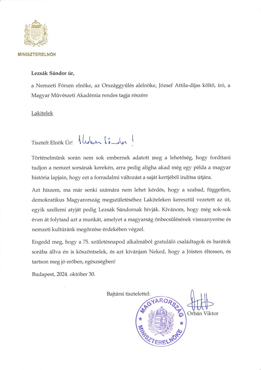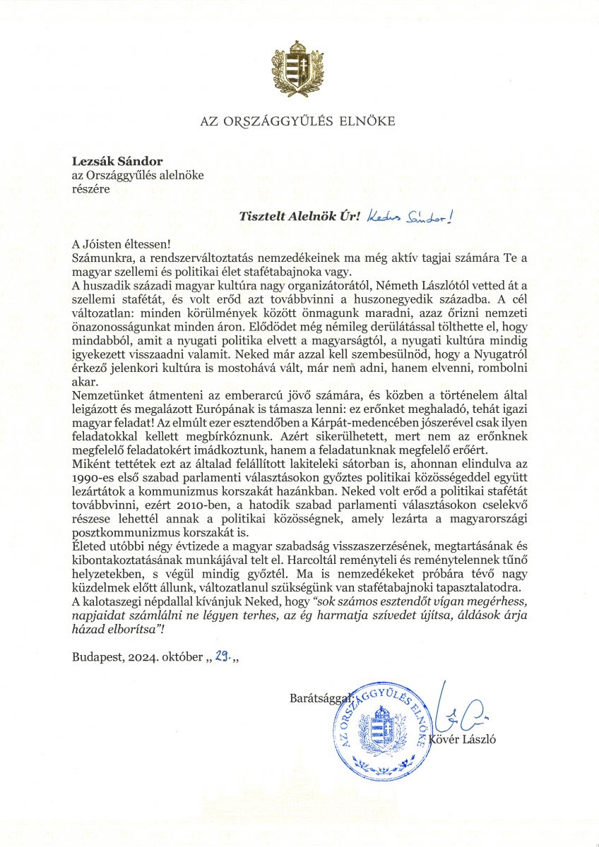 Lezsák Sándor Elnök urat 75. születésnapja alkalmából levélben köszöntötte Orbán Viktor Magyarország Miniszterelnöke és Kövér László az Országgyűlés Elnöke.