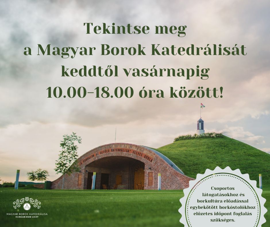 Szeretettel várjuk a kedves Érdeklődőket a Magyar Borok Katedrálisában, amely a nyári időszakban keddtől vasárnapig 10.00-18.00 óra között szabadon látogatható.