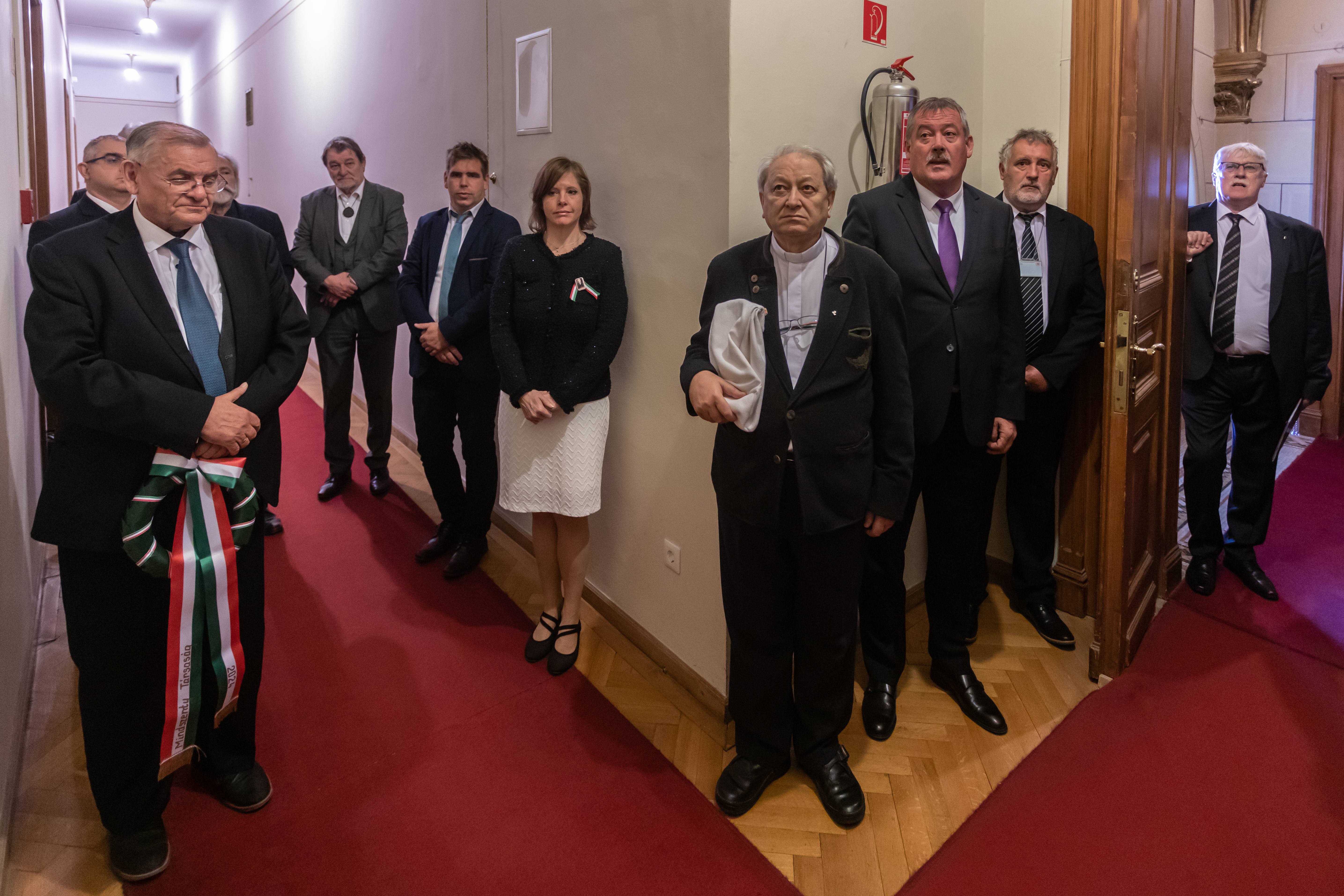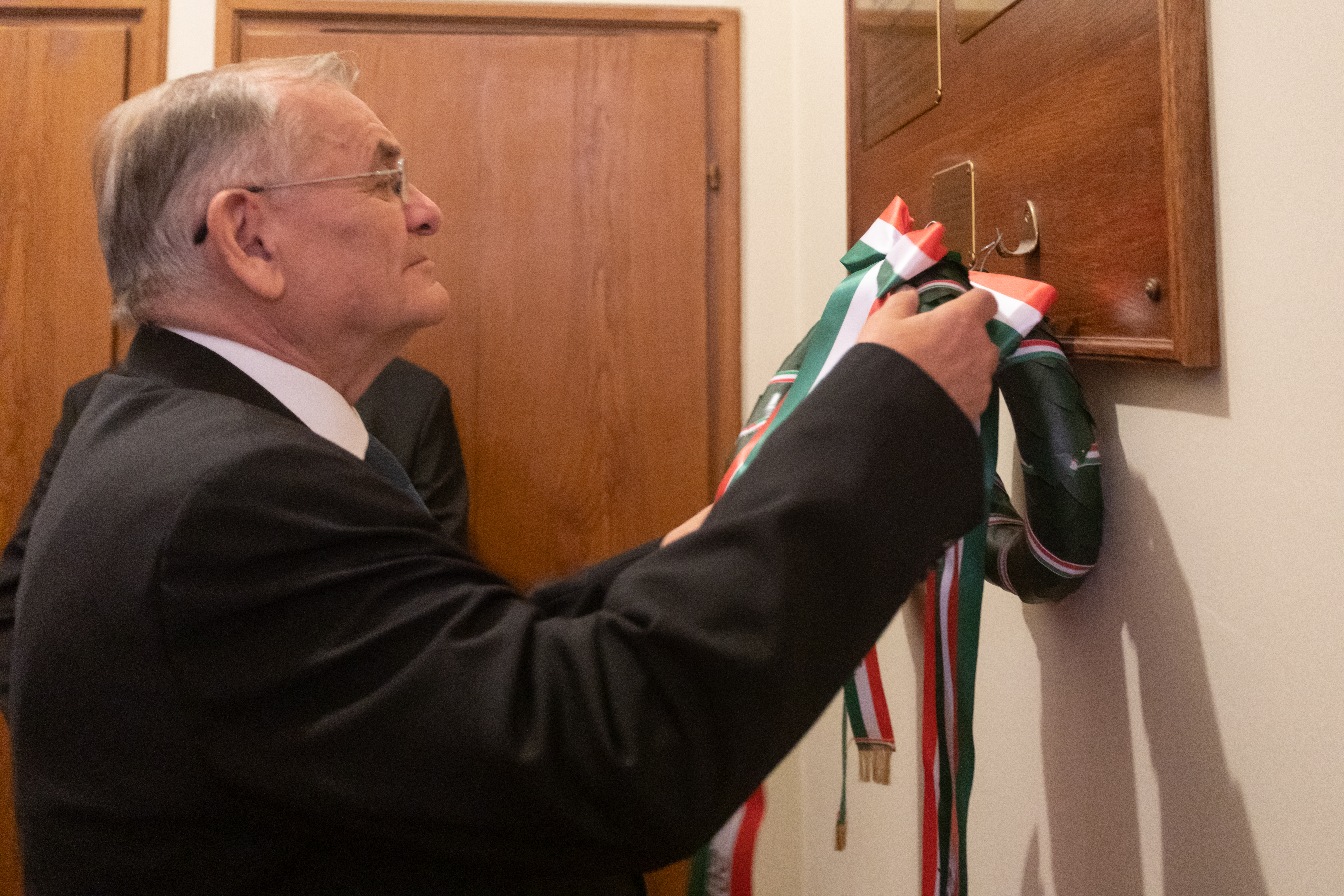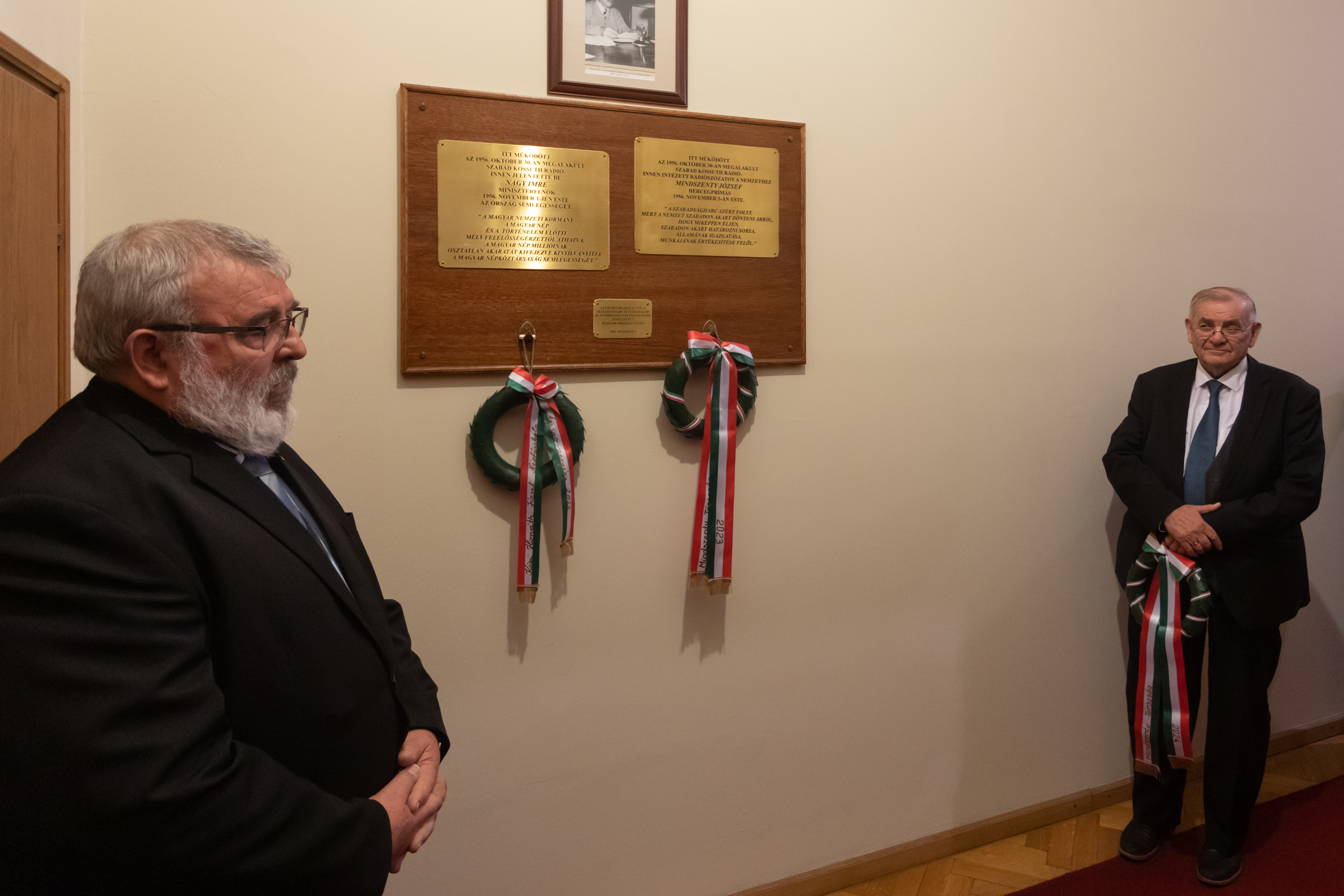 Az emlékérmek átadása előtt a Mindszenty Társaság képviselői megkoszorúzták az Országházban a bíboros emléktábláját, amely az 1956. november 3-i eseménynek állít emléket, amikor a hercegprímás szózatot intézett a nemzethez.