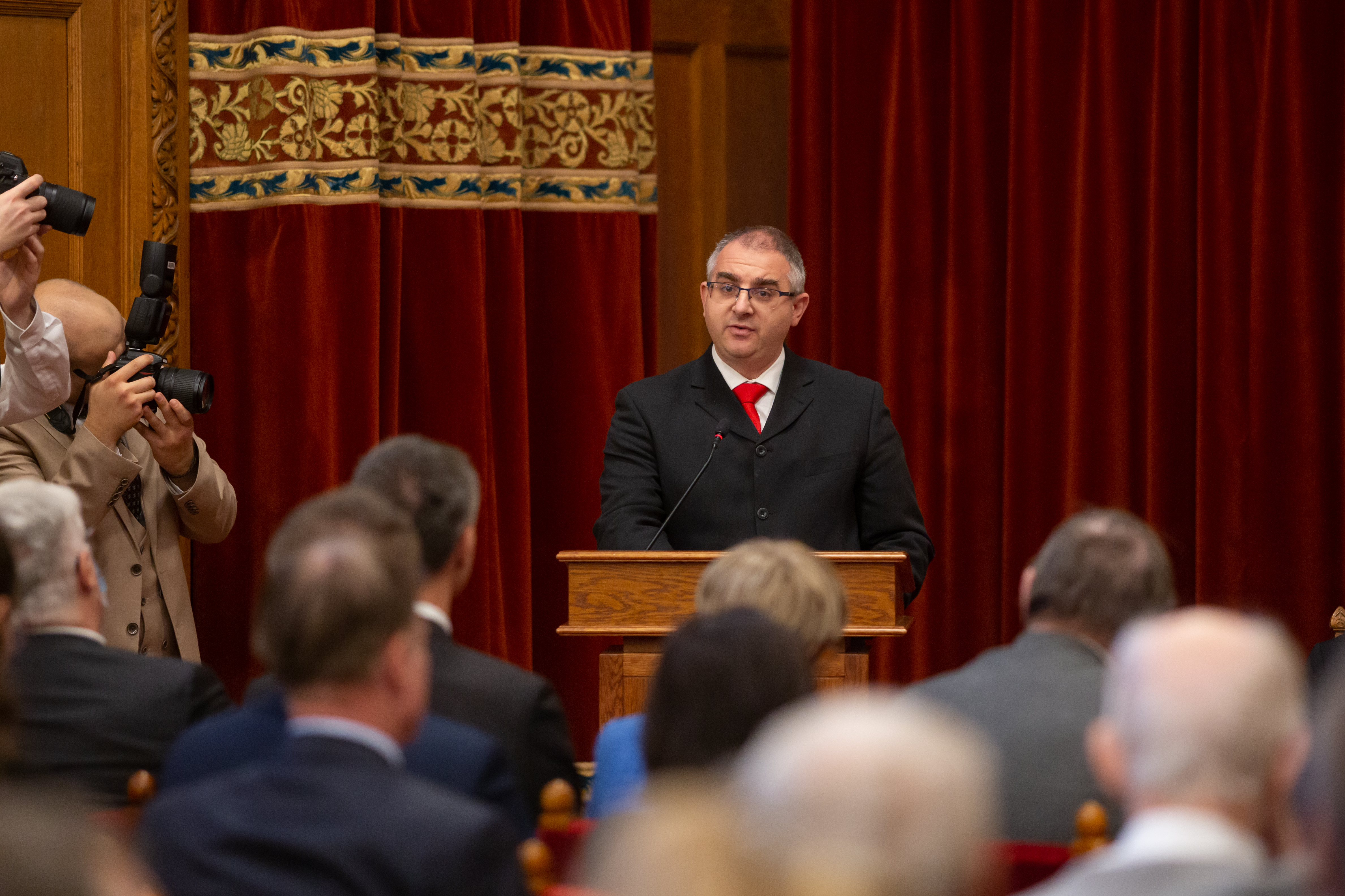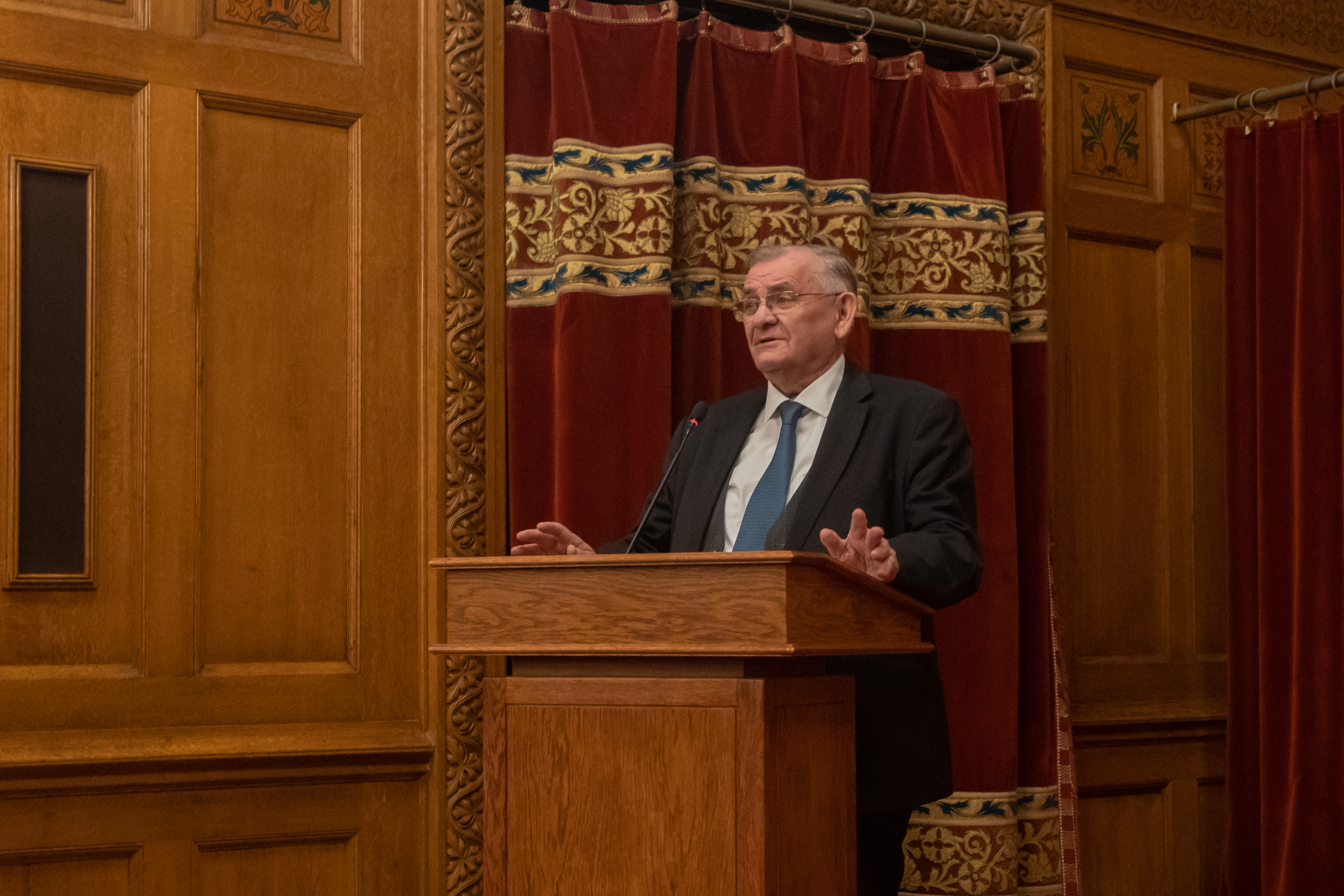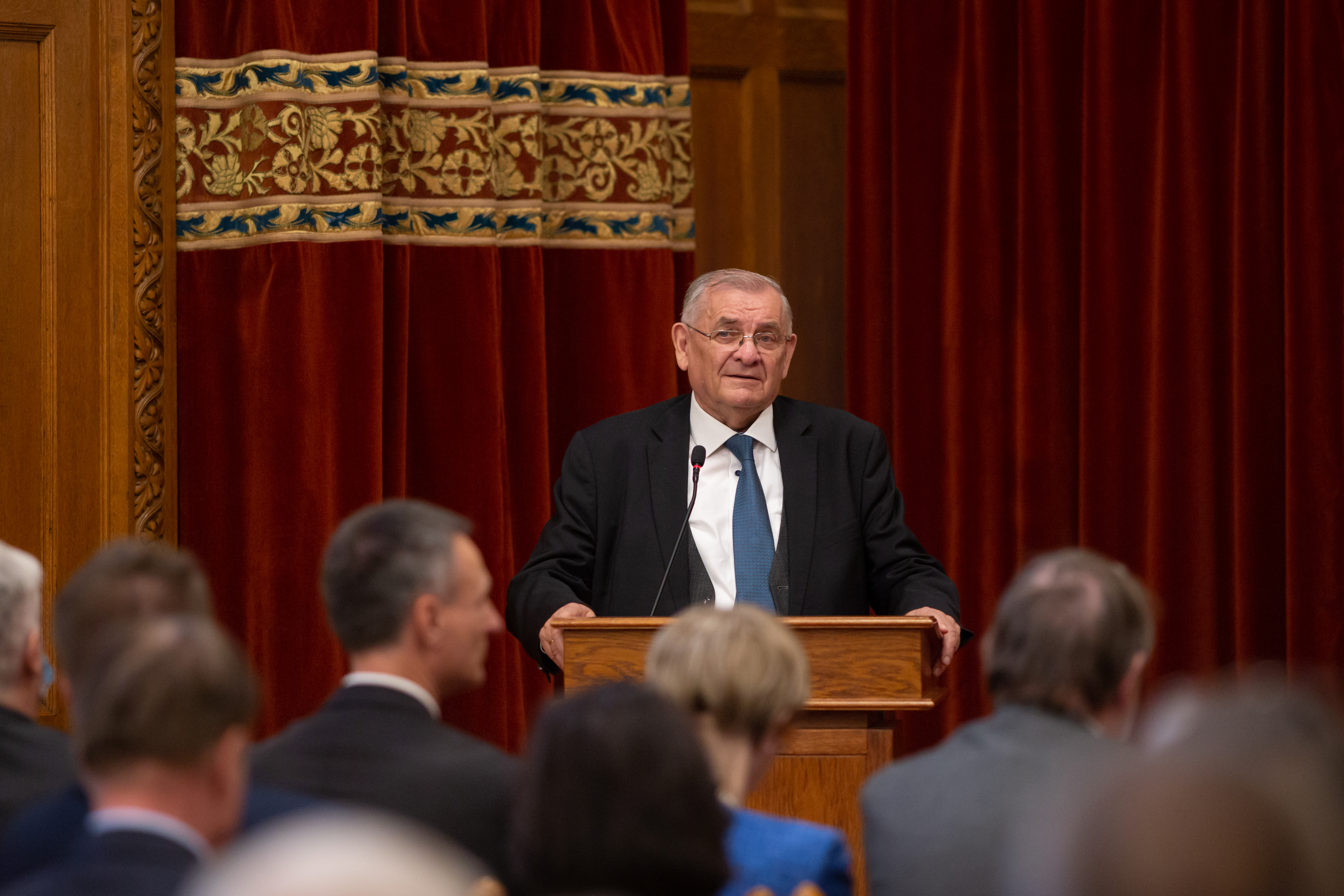 Lezsák Sándor a Mindszenty Társaság immár másfél évtizedes munkáját méltatta. Arról beszélt, mennyire megrendítő élmény volt számára megismerni ezeket az életutakat, a „magyar életsorsot, amit megélünk itt, és kis szigetekként a világban”. Gyásznap van – mondta, személyes élményét osztva meg: „Hétéves voltam azon a napon. Éreztem, valami történik. Iszonyú hajnal volt. Talán minden jó következik, nem kell félni, még ez élt bennem az azt megelőző este. Valaki beszélt a rádióban. Akkor még nem tudtam, hogy Mindszenty József volt az. Anyám örömkönnyei kísérték. Hitem ebből a tápláló forrásból született, akkor ott este, aztán a szovjet tankok dübörgése sajátos helyzetbe hozta. Bátorságpróbaként barátommal messziről figyeltük az amerikai nagykövetséget, hátha meglátjuk őt az ablakban. Később szüleim jártak Mariazellbe, Mindszenty bíboros sírjához, aztán én mondhattam köszöntőt, amikor hazahozták a koporsóját. Akkor ismertem meg a bennem legendává nőtt Szőke János atyát. Bizalmába fogadott, így kerültem még közelebb Mindszenty bíboros életútjához. Nekem nem halt meg. Élő valóság, fegyelmez és figyelmeztet arra, hogy nem hal meg a remény, mert képes életre kelteni egy ima, egy közösségi próbatétel. A tankok dübörgésében akkor ott volt a szabadság iránti vágy, és itt van ma is, hogy mi rendelkezhessünk sorsunkkal. Magyarként, keresztényként tenni a dolgunkat, ezt üzeni ma is Mindszenty.”