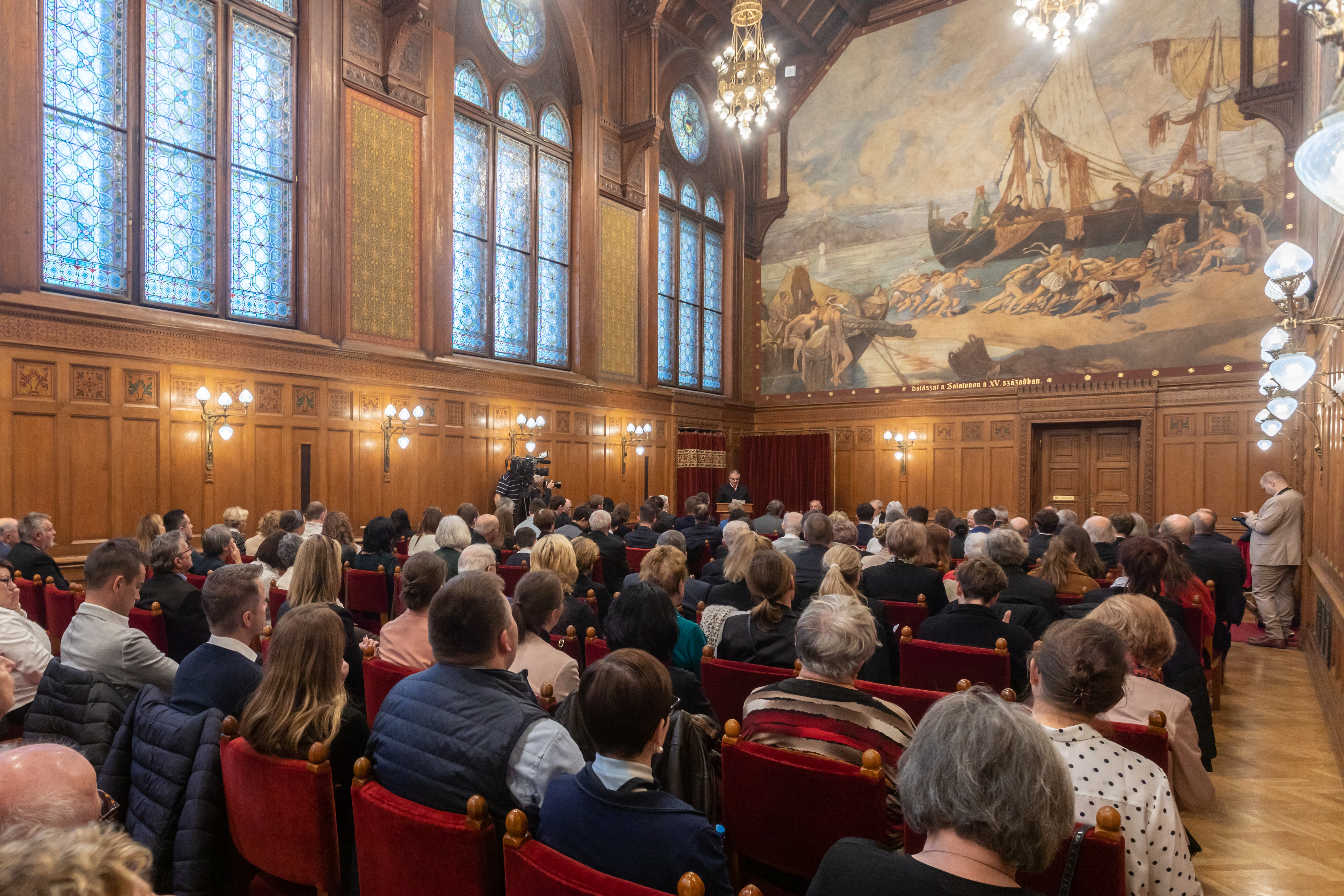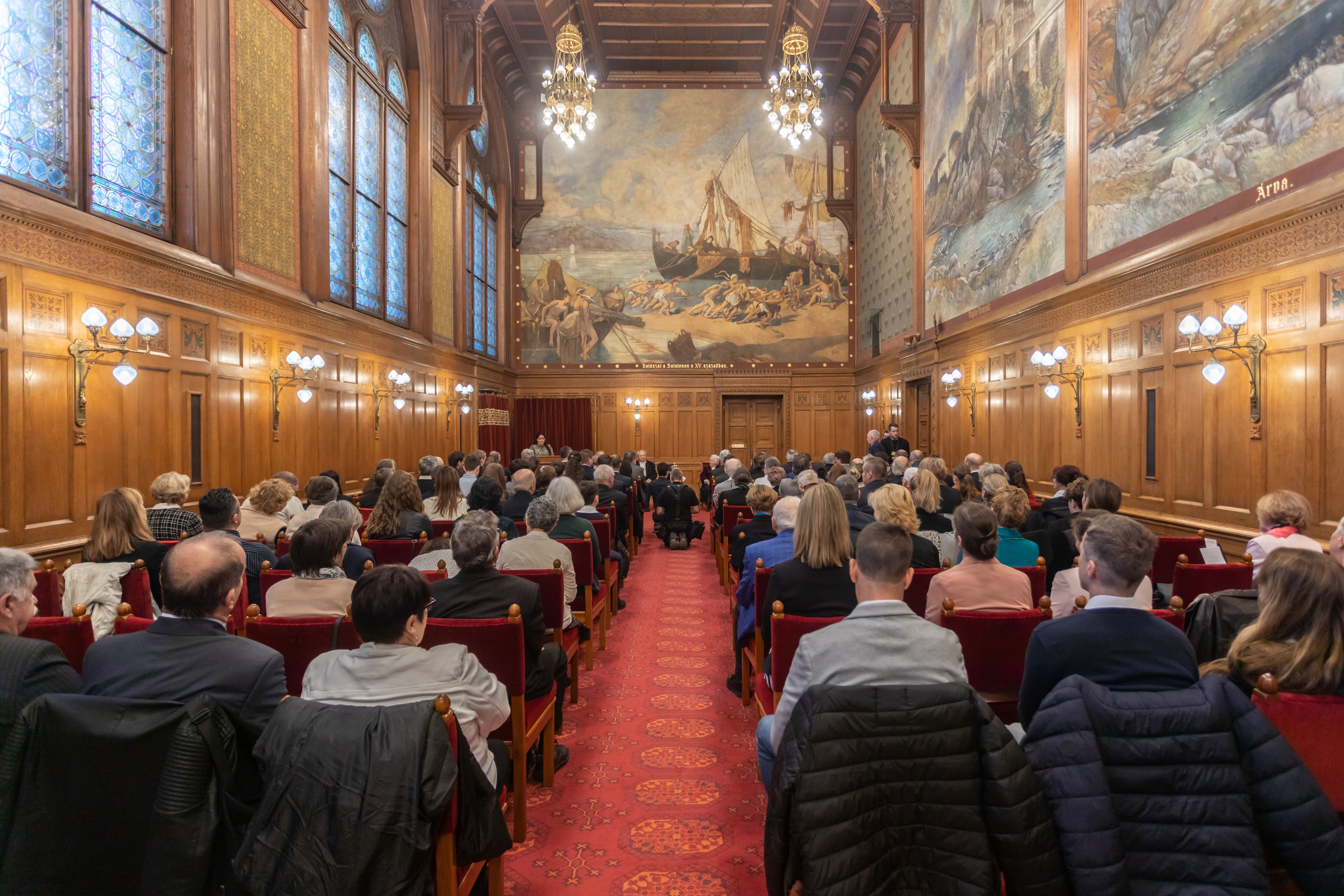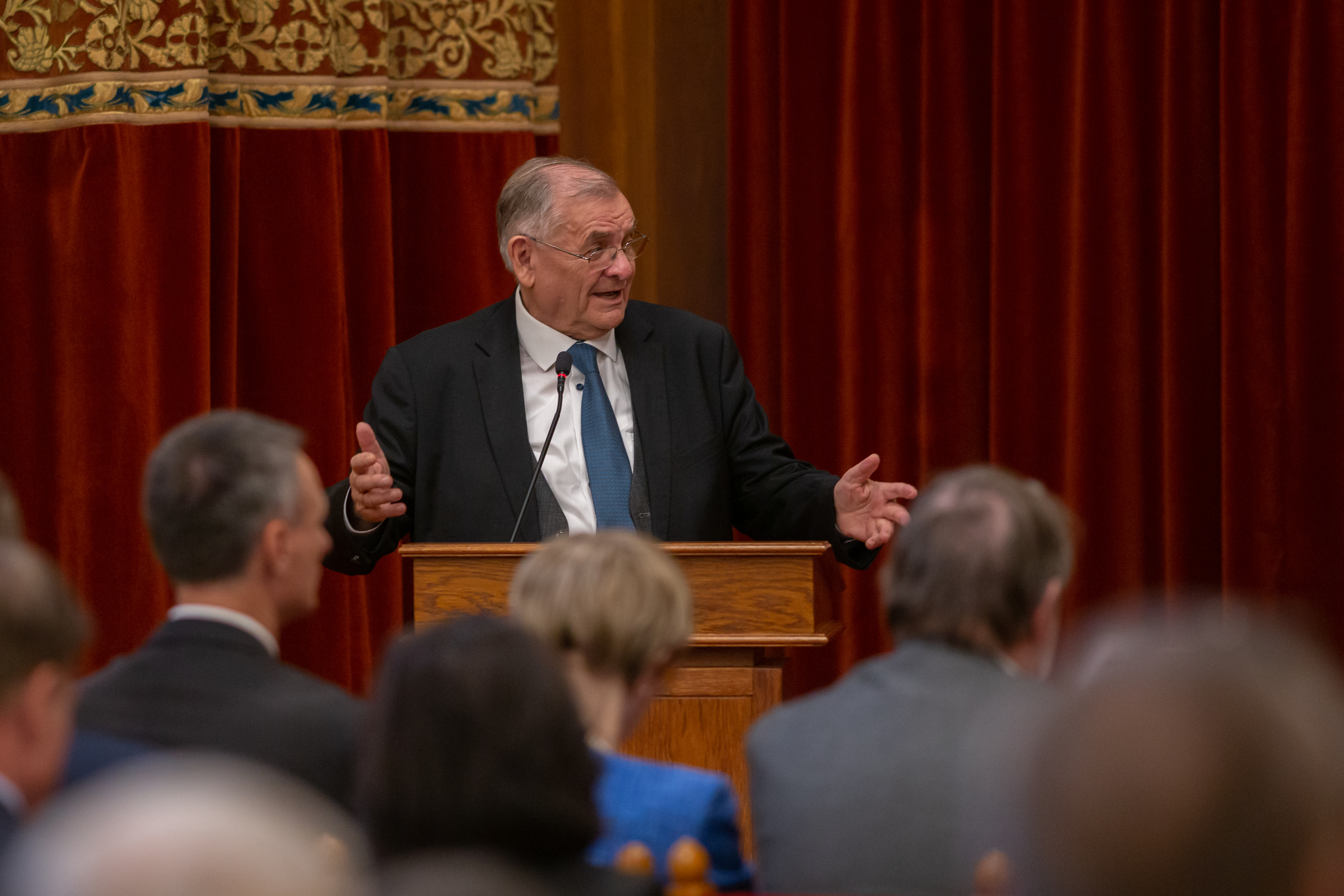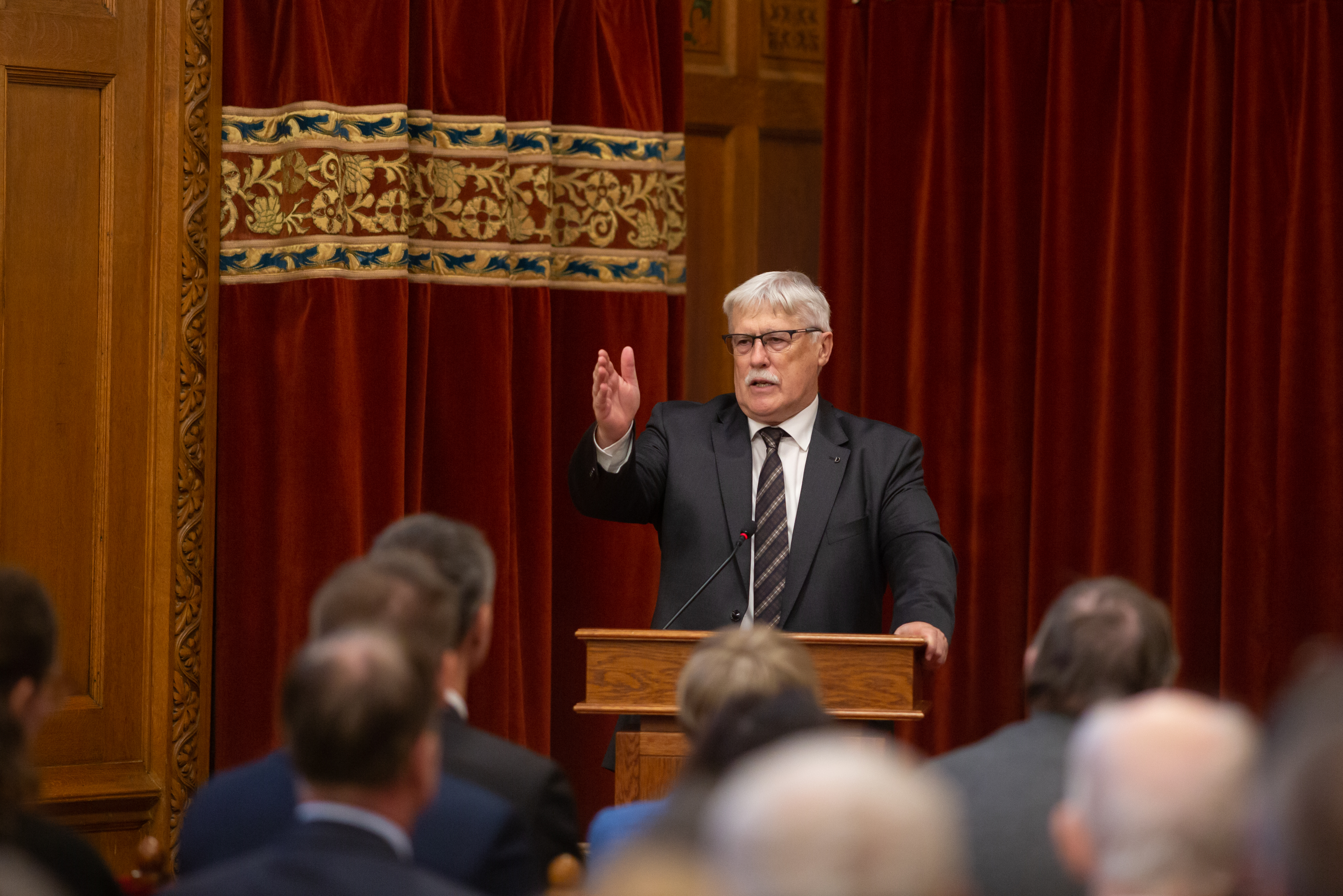 Lezsák Sándor a Mindszenty Társaság immár másfél évtizedes munkáját méltatta. Arról beszélt, mennyire megrendítő élmény volt számára megismerni ezeket az életutakat, a „magyar életsorsot, amit megélünk itt, és kis szigetekként a világban”. Gyásznap van – mondta, személyes élményét osztva meg: „Hétéves voltam azon a napon. Éreztem, valami történik. Iszonyú hajnal volt. Talán minden jó következik, nem kell félni, még ez élt bennem az azt megelőző este. Valaki beszélt a rádióban. Akkor még nem tudtam, hogy Mindszenty József volt az. Anyám örömkönnyei kísérték. Hitem ebből a tápláló forrásból született, akkor ott este, aztán a szovjet tankok dübörgése sajátos helyzetbe hozta. Bátorságpróbaként barátommal messziről figyeltük az amerikai nagykövetséget, hátha meglátjuk őt az ablakban. Később szüleim jártak Mariazellbe, Mindszenty bíboros sírjához, aztán én mondhattam köszöntőt, amikor hazahozták a koporsóját. Akkor ismertem meg a bennem legendává nőtt Szőke János atyát. Bizalmába fogadott, így kerültem még közelebb Mindszenty bíboros életútjához. Nekem nem halt meg. Élő valóság, fegyelmez és figyelmeztet arra, hogy nem hal meg a remény, mert képes életre kelteni egy ima, egy közösségi próbatétel. A tankok dübörgésében akkor ott volt a szabadság iránti vágy, és itt van ma is, hogy mi rendelkezhessünk sorsunkkal. Magyarként, keresztényként tenni a dolgunkat, ezt üzeni ma is Mindszenty.”