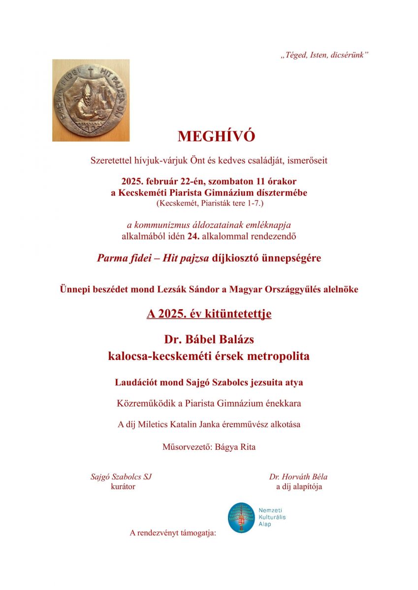 MEGHÍVÓ a Parma fidei – Hit pajzsa díjkiosztó ünnepségére