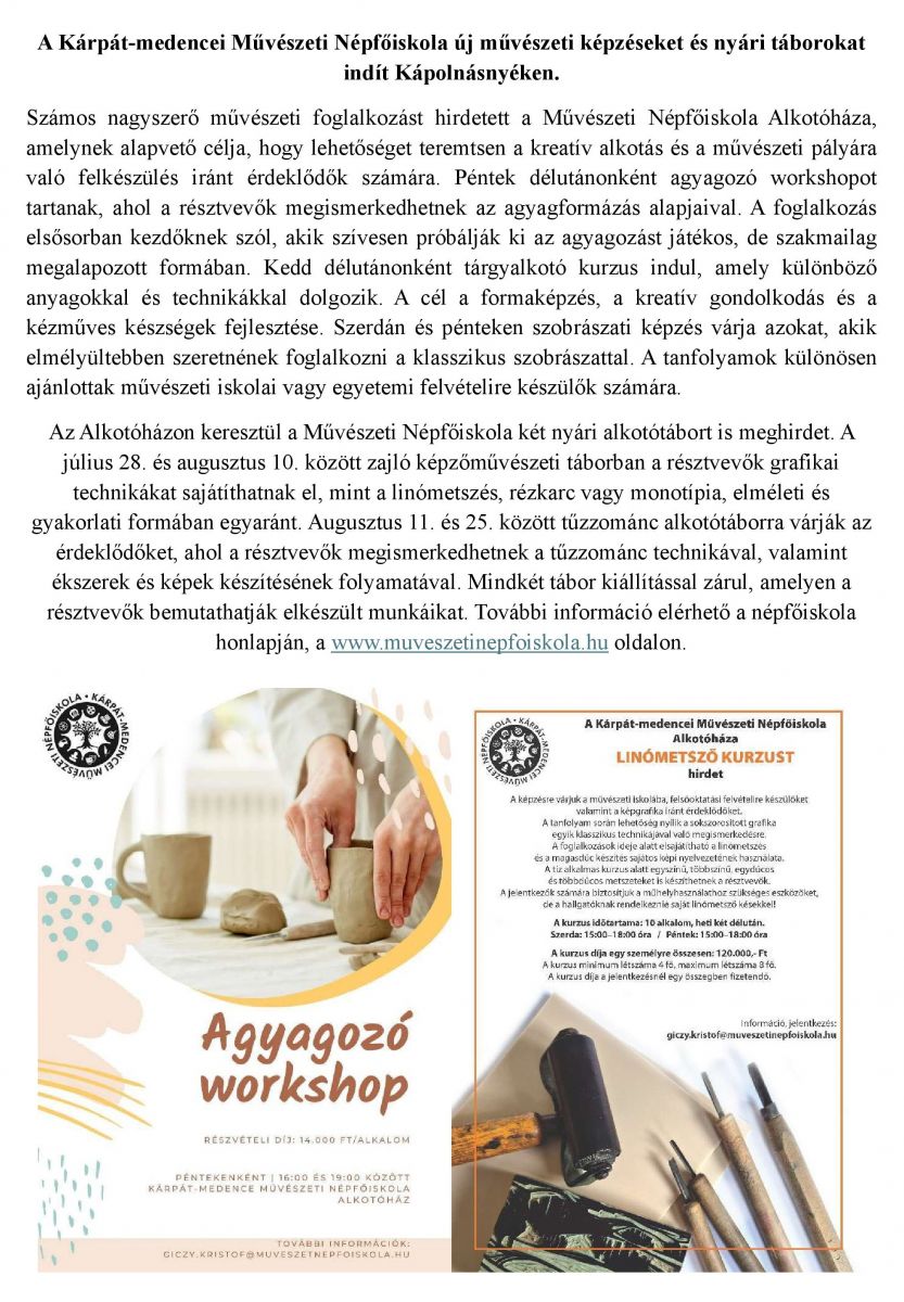 A Kárpát-medencei Művészeti Népfőiskola új művészeti képzéseket és nyári táborokat indít Kápolnásnyéken.