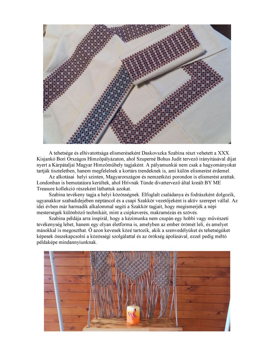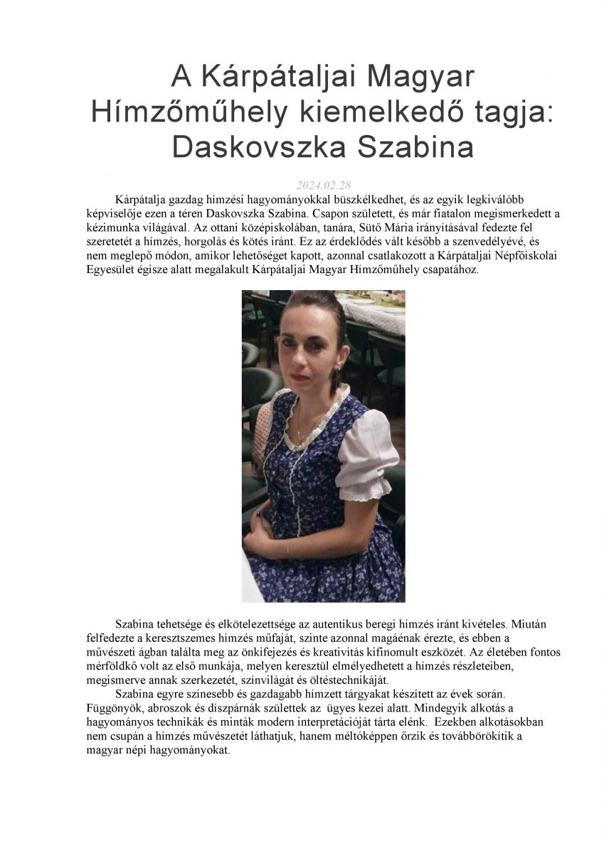 A Kárpátaljai Magyar Hímzőműhely kiemelkedő tagja: Daskovszka Szabina