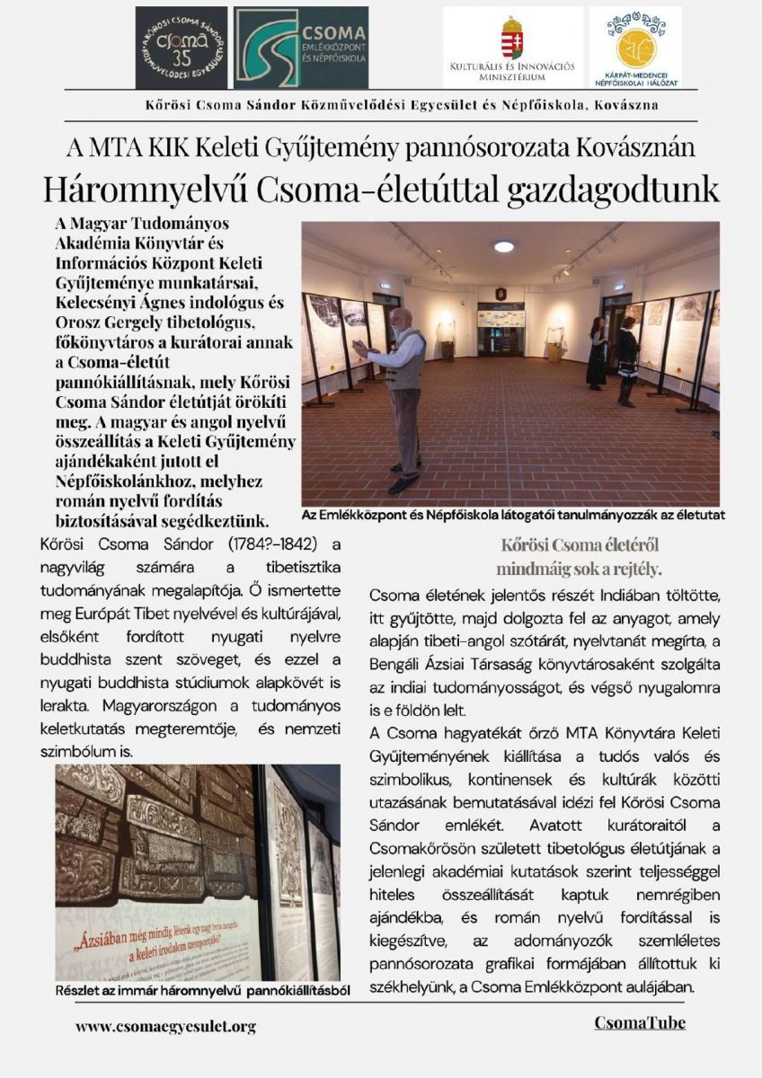 A Magyar Tudományos Akadémia Könyvtár és Információs Központ Keleti Gyűjteménye munkatársai, Kelecsényi Ágnes indológus és igazgató, valamint Orosz Gergely tibetológus-főkönyvtáros a kurátorai annak a Csoma-életút pannókiállításnak, mely Kőrösi Csoma Sándor életútját a jelenlegi feltárások szerint hitelesen örökíti meg. A magyar és angol nyelvű összeállítás a Keleti Gyűjtemény ajándékaként jutott el Népfőiskolánkhoz, melyhez mi román nyelvű fordítás biztosításával segédkeztünk. A háromnyelvű pannókiállítás székhelyünk aulájában várja a látogatókat.
