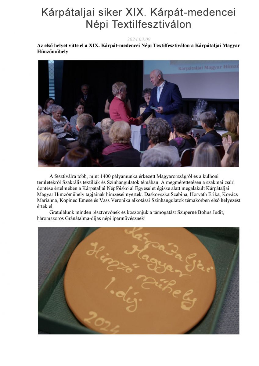 Kárpátaljai siker XIX. Kárpát-medencei Népi Textilfesztiválon