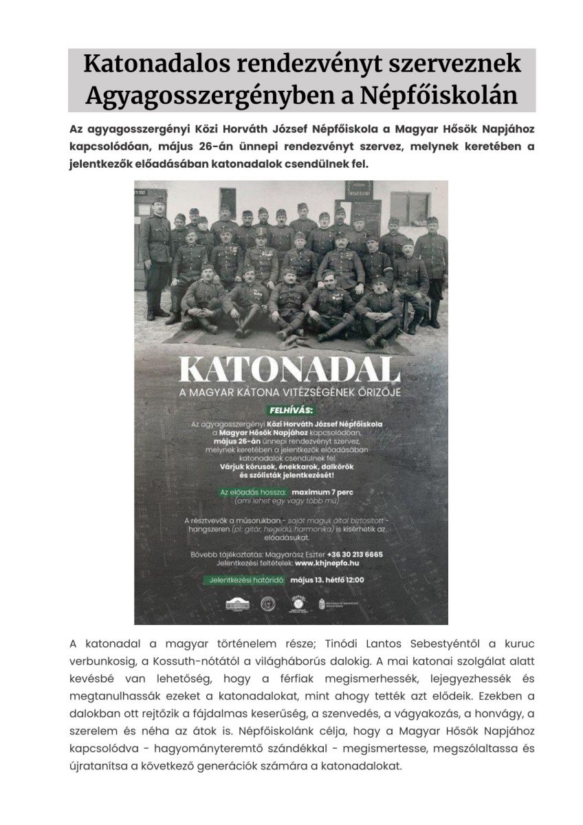 Katonadalos rendezvényt szerveznek Agyagosszergényben a Népfőiskolán