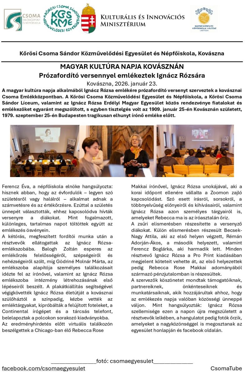 MAGYAR KULTÚRA NAPJA KOVÁSZNÁN Prózafordító versennyel emlékeztek Ignácz Rózsára