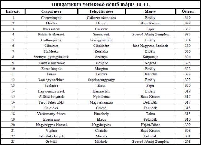 Eredményeik alapján 24 magyarországi és 24 határon túli csapat mérkőzött meg az április végén zajló elődöntőben, onnan pedig a legjobb 23 csapat jutott tovább a döntőbe.
