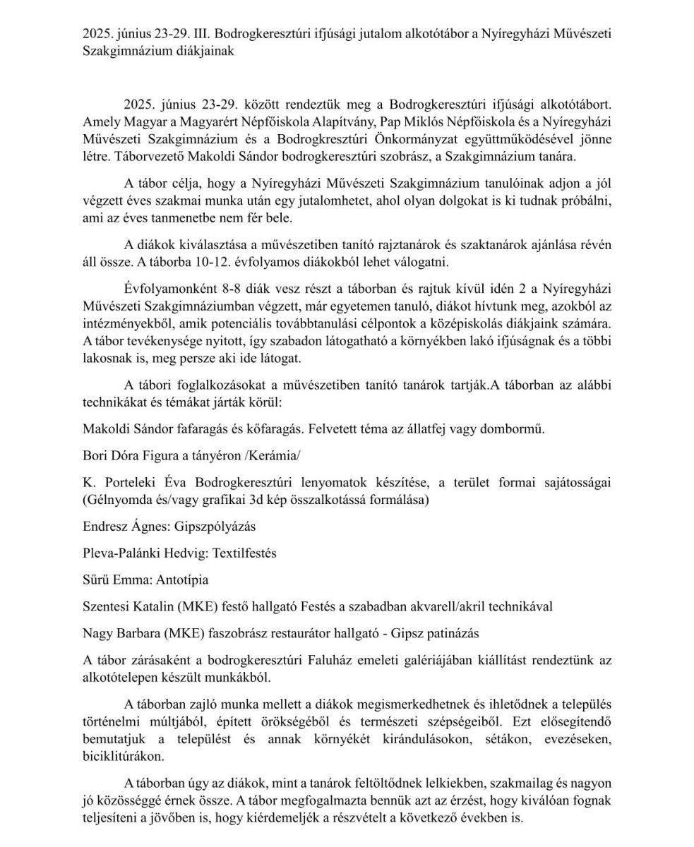 2025. június 23-29. III. Bodrogkeresztúri ifjúsági alkotótábor a Nyíregyházi Művészeti Szakgimnázium diákjainak