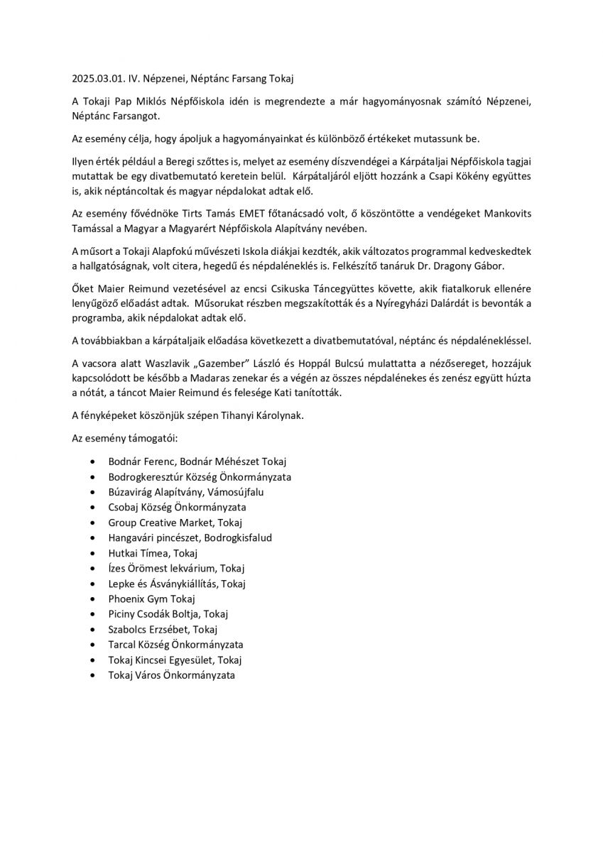 2025.03.01. IV. Népzenei, Néptánc Farsang Tokaj