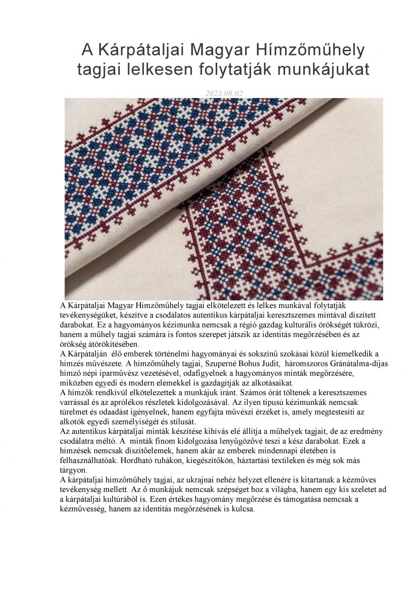 A Kárpátaljai Magyar Hímzőműhely tagjai lelkesen folytatják munkájukat