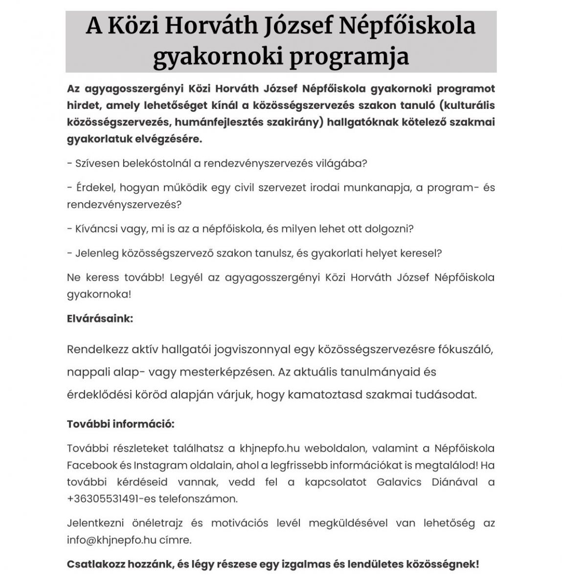 A Közi Horváth József Népfőiskola gyakornoki programja
