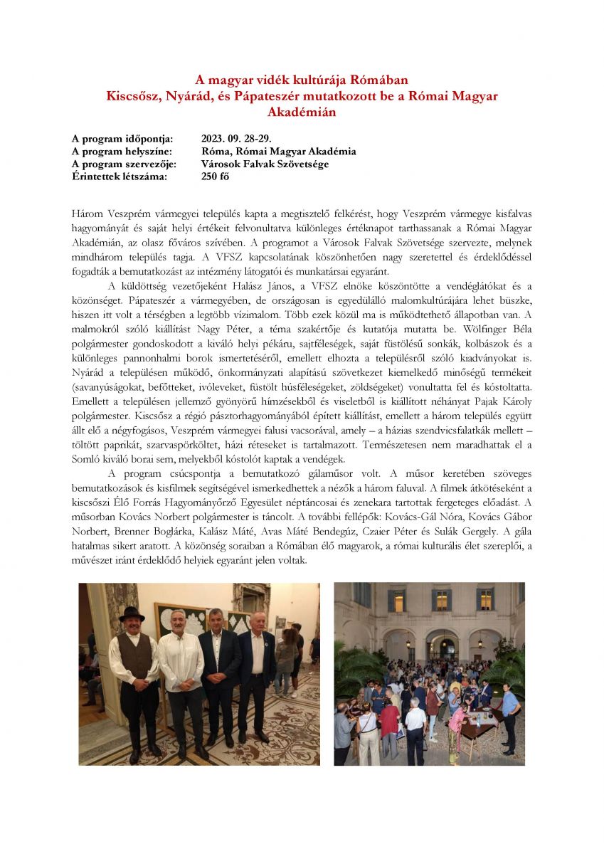 A magyar vidék kultúrája Rómában Kiscsősz, Nyárád, és Pápateszér mutatkozott be a Római Magyar Akadémián