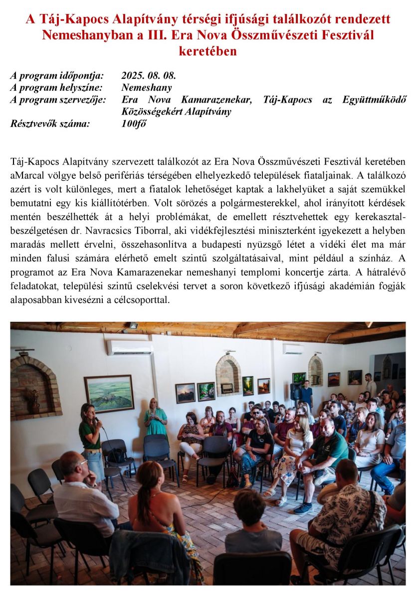 A Táj-Kapocs Alapítvány térségi ifjúsági találkozót rendezett Nemeshanyban a III. Era Nova Összművészeti Fesztivál keretében