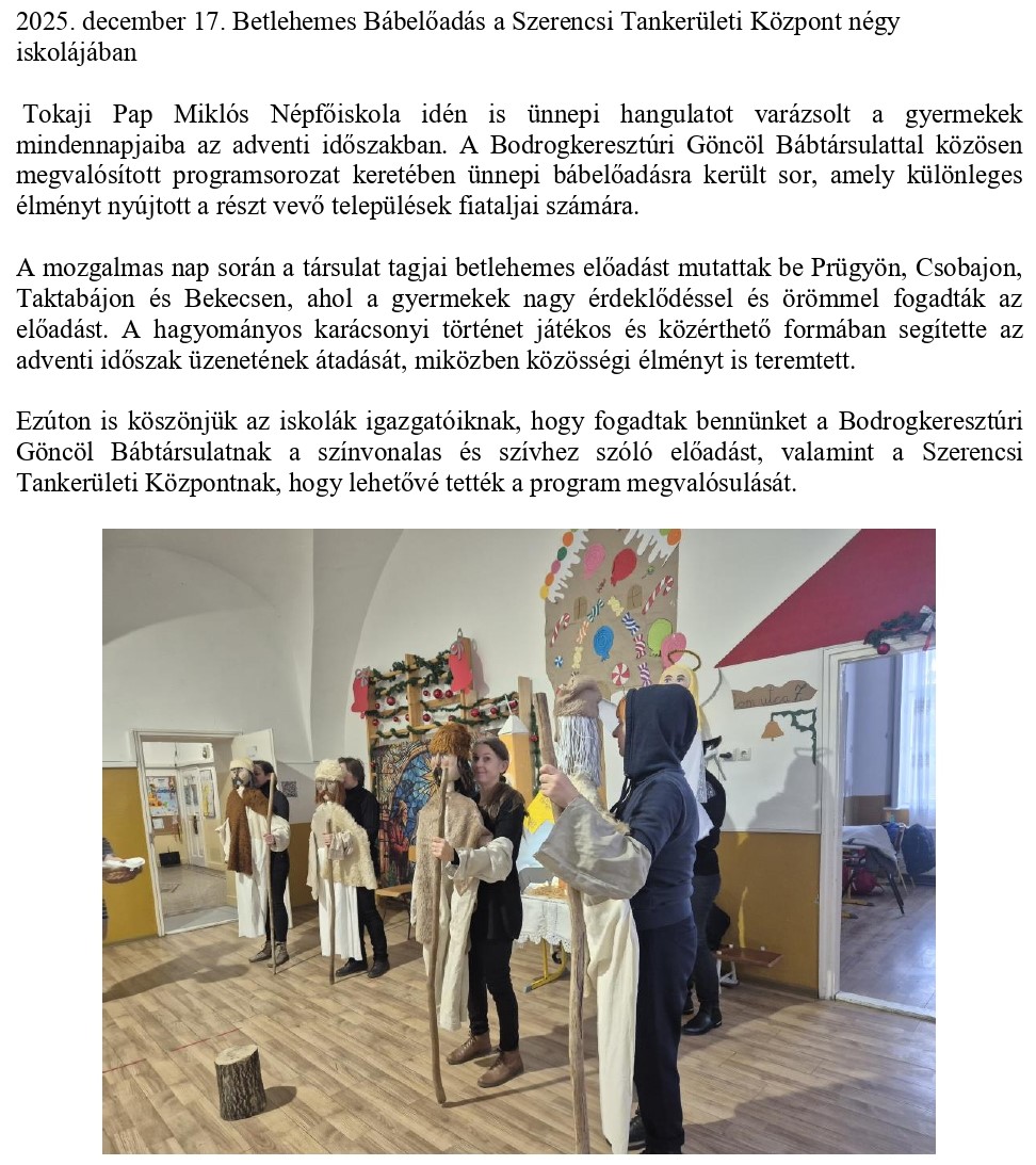 Betlehemes Bábelőadás a Szerencsi Tankerületi Központ négy iskolájában