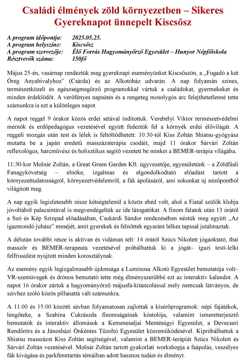 Családi élmények zöld környezetben – Sikeres Gyereknapot ünnepelt Kiscsősz