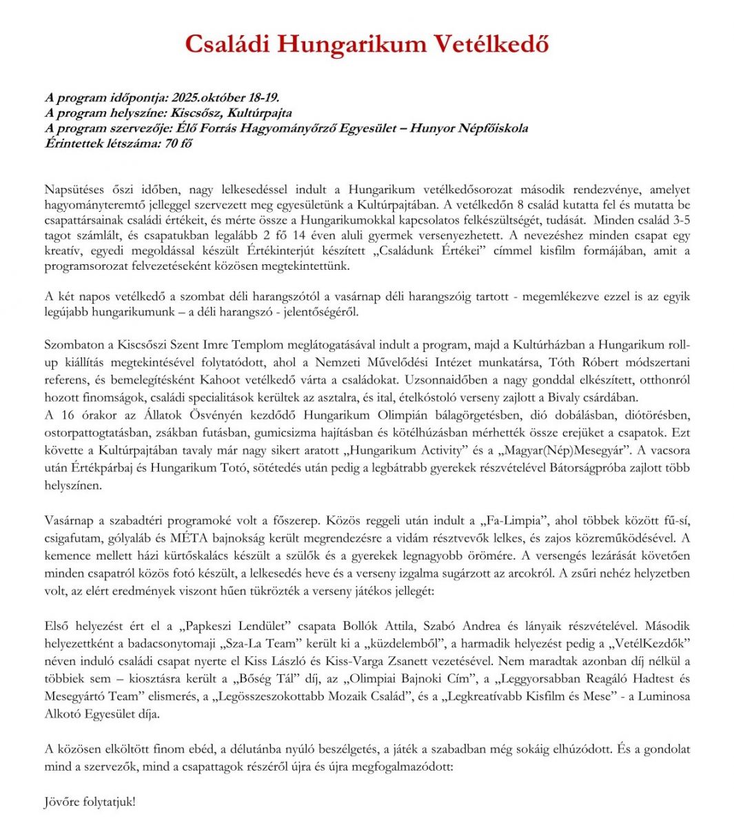 Családok Hungarikum vetélkedője Kiscsőszön