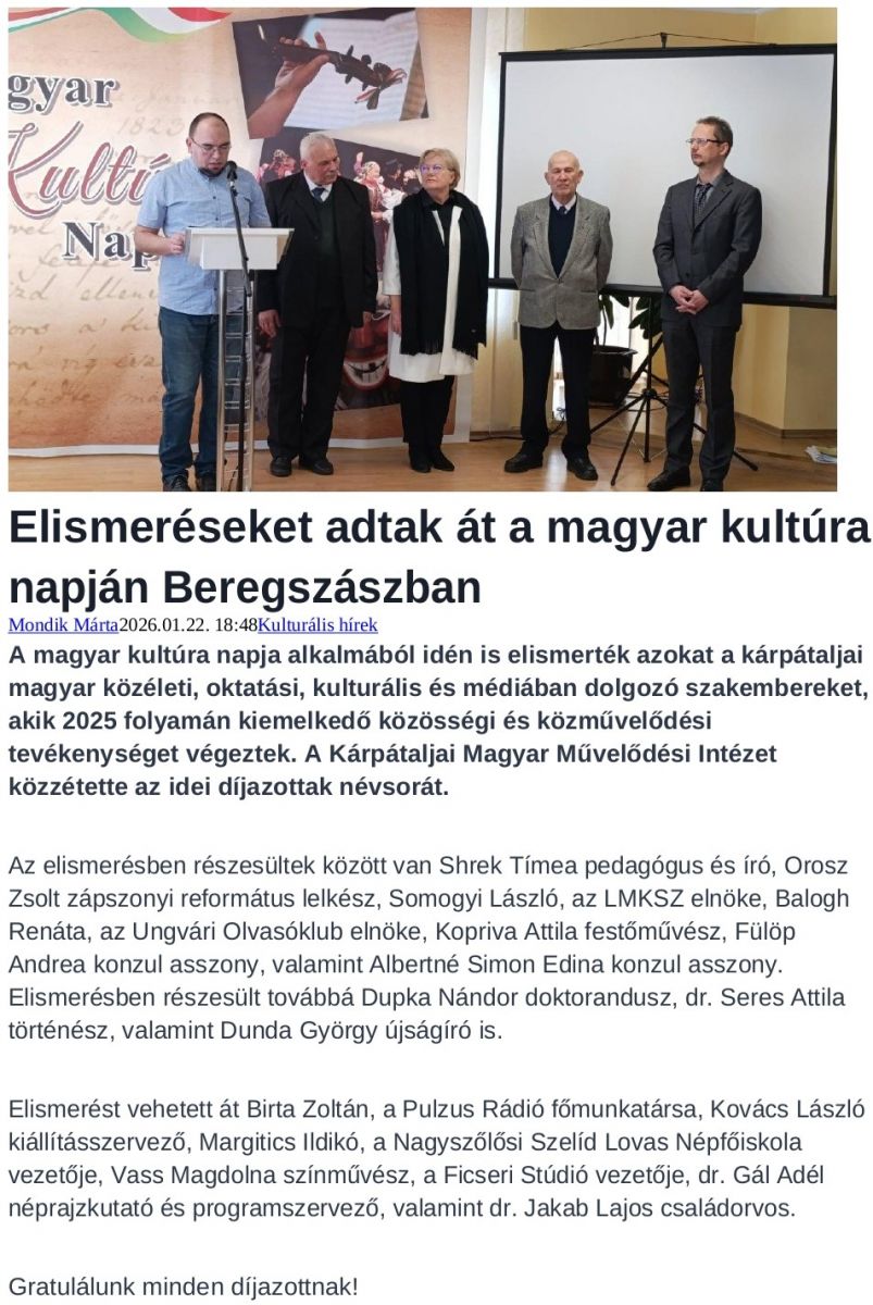Elismeréseket adtak át a magyar kultúra napján Beregszászban