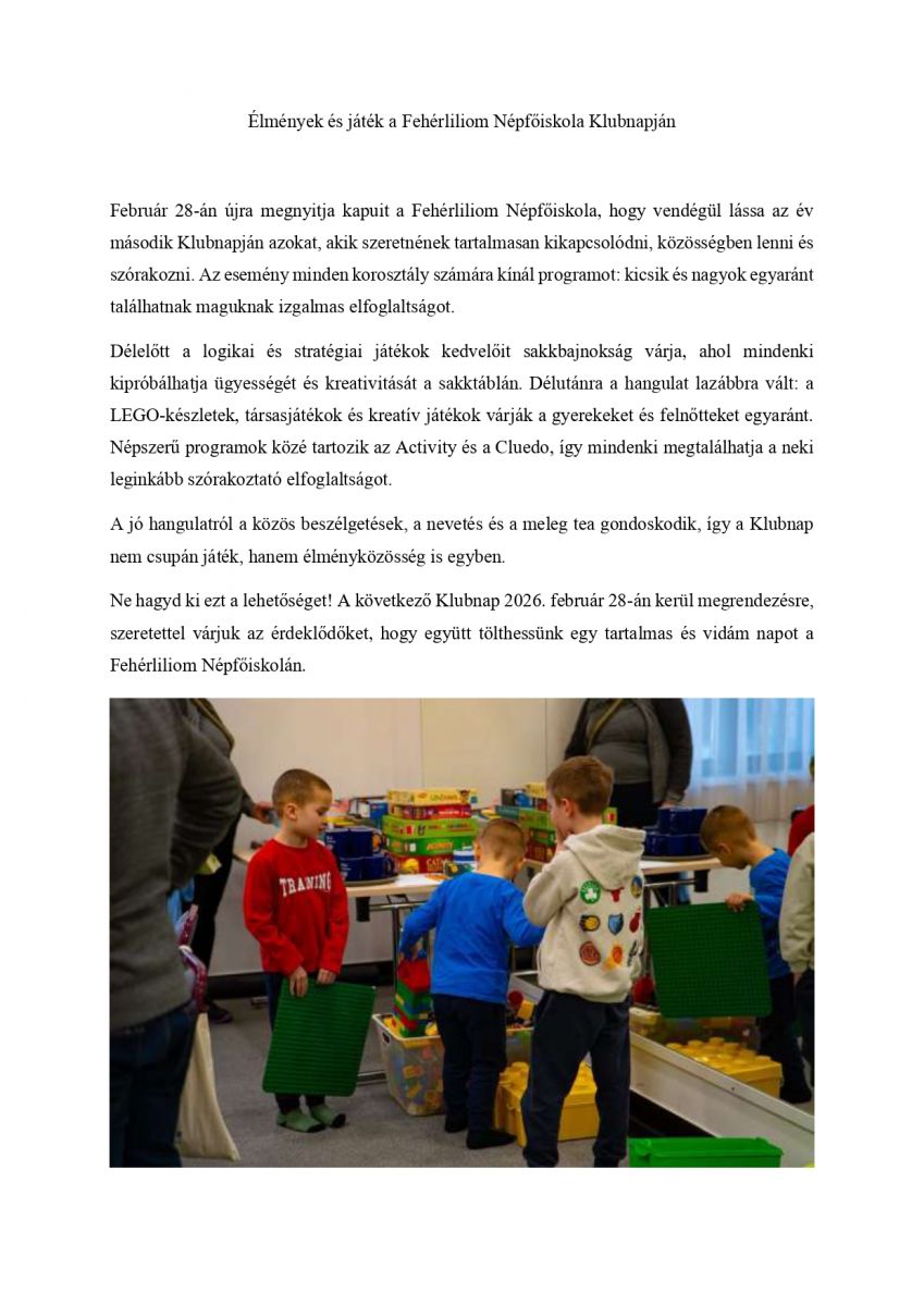 Élmények és játék a Fehérliliom Népfőiskola Klubnapján