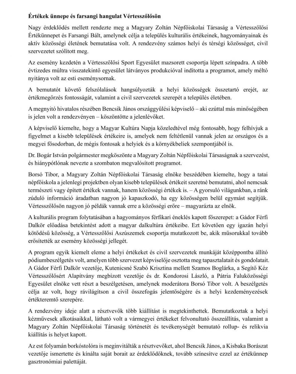 Értékek ünnepe és farsangi hangulat Vértesszőlősön