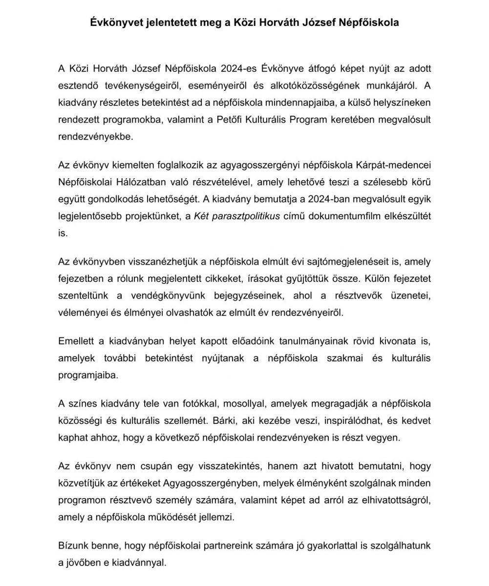 Évkönyvet jelentetett meg a Közi Horváth József Népfőiskola
