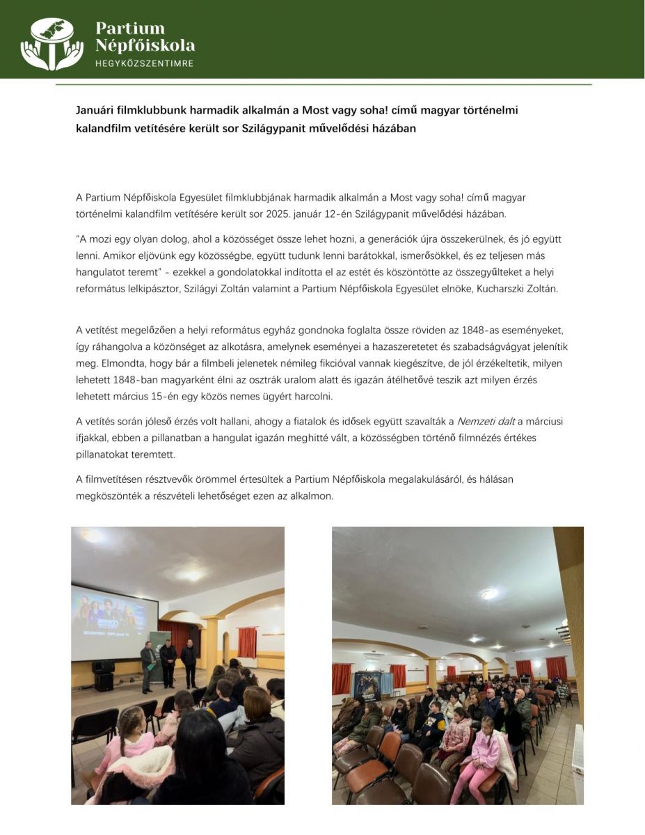 Filmklub - Szilágypanit - Most vagy soha! című történelmi kalandfilm vetítése