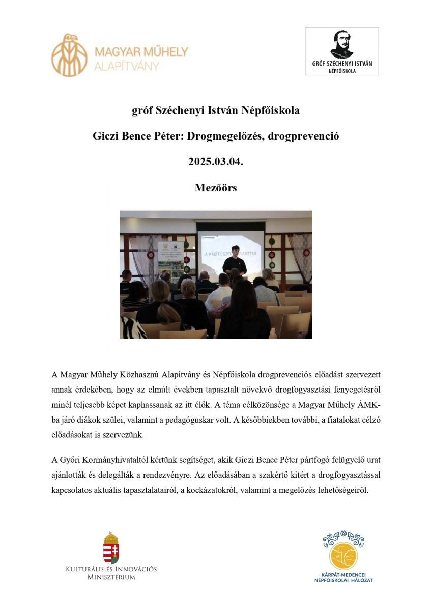 Giczi Bence Péter drogprevenciós előadása Mezőörsön