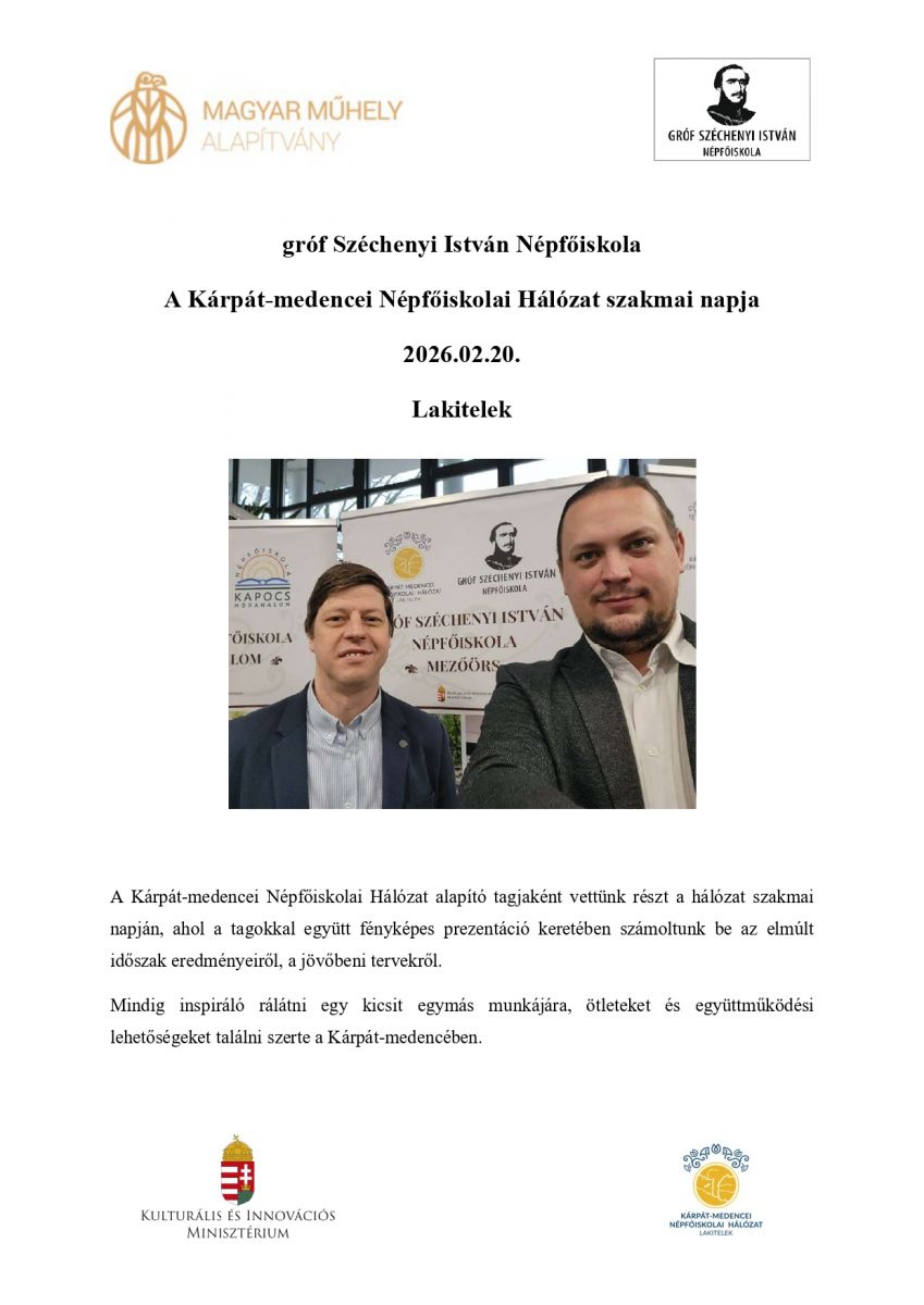 További információért látogassanak el a mezőörsi Magyar Műhely Közhasznú Alapítvány - gr. Széchenyi István Népfőiskola honlapjára.