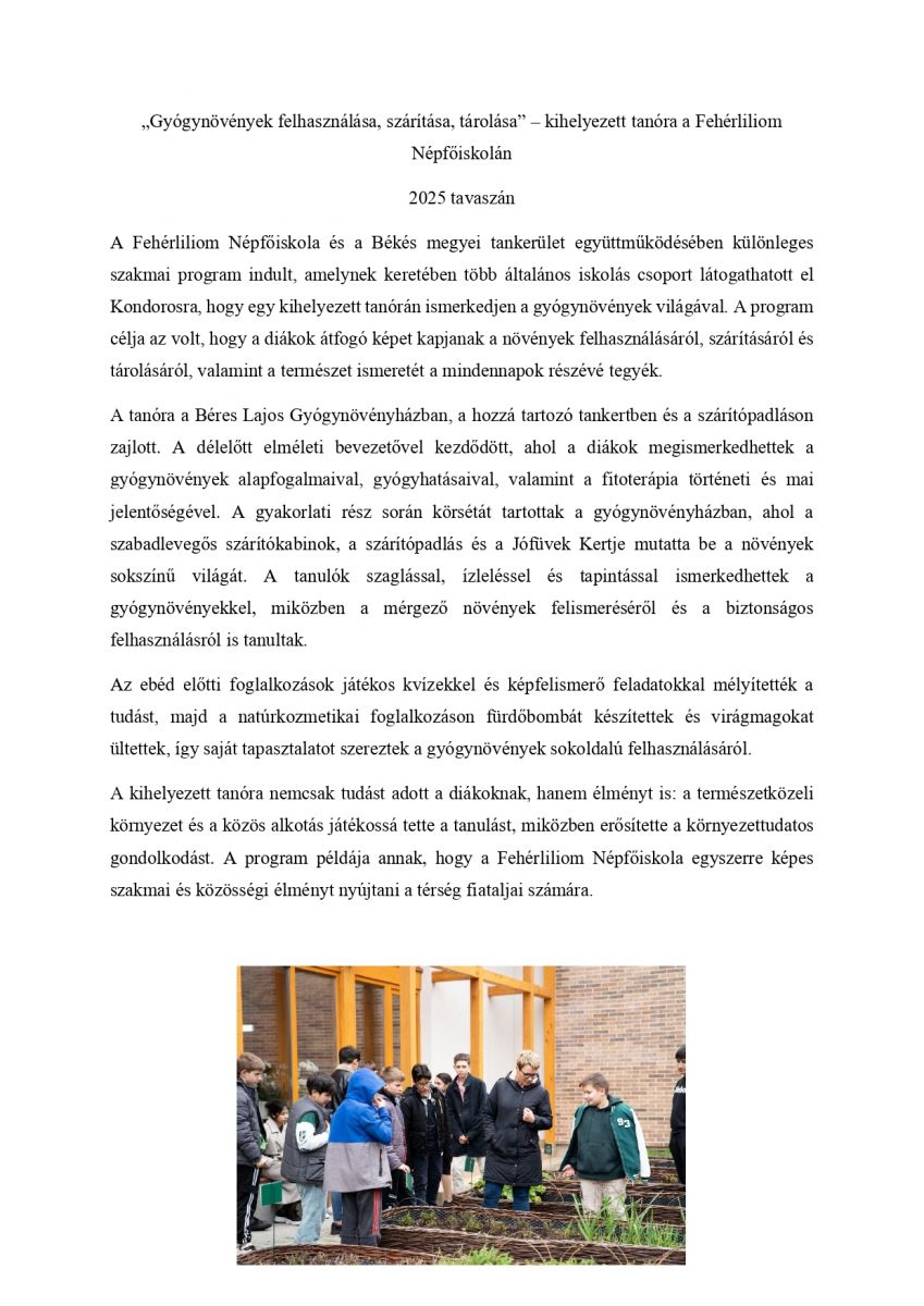 „Gyógynövények felhasználása, szárítása, tárolása” – kihelyezett tanóra a Fehérliliom Népfőiskolán