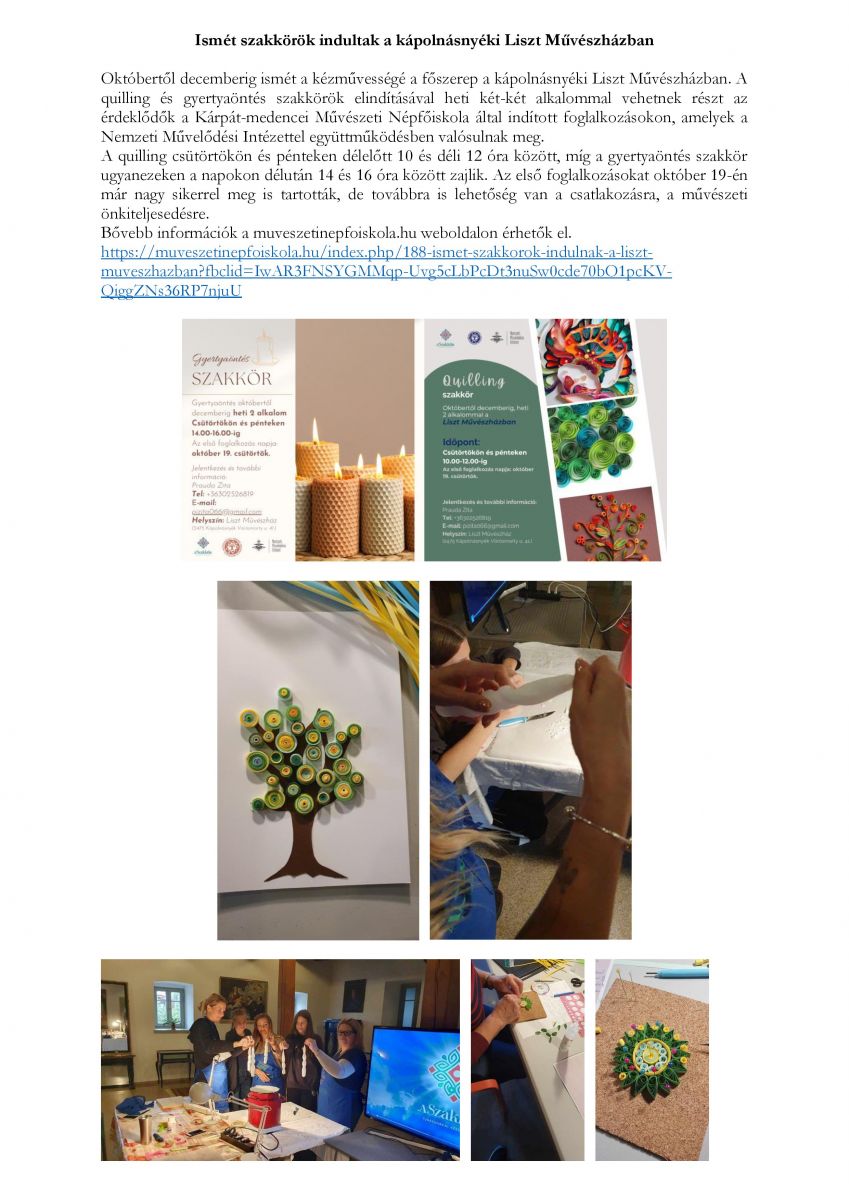 Ismét szakkörök indultak a kápolnásnyéki Liszt Művészházban