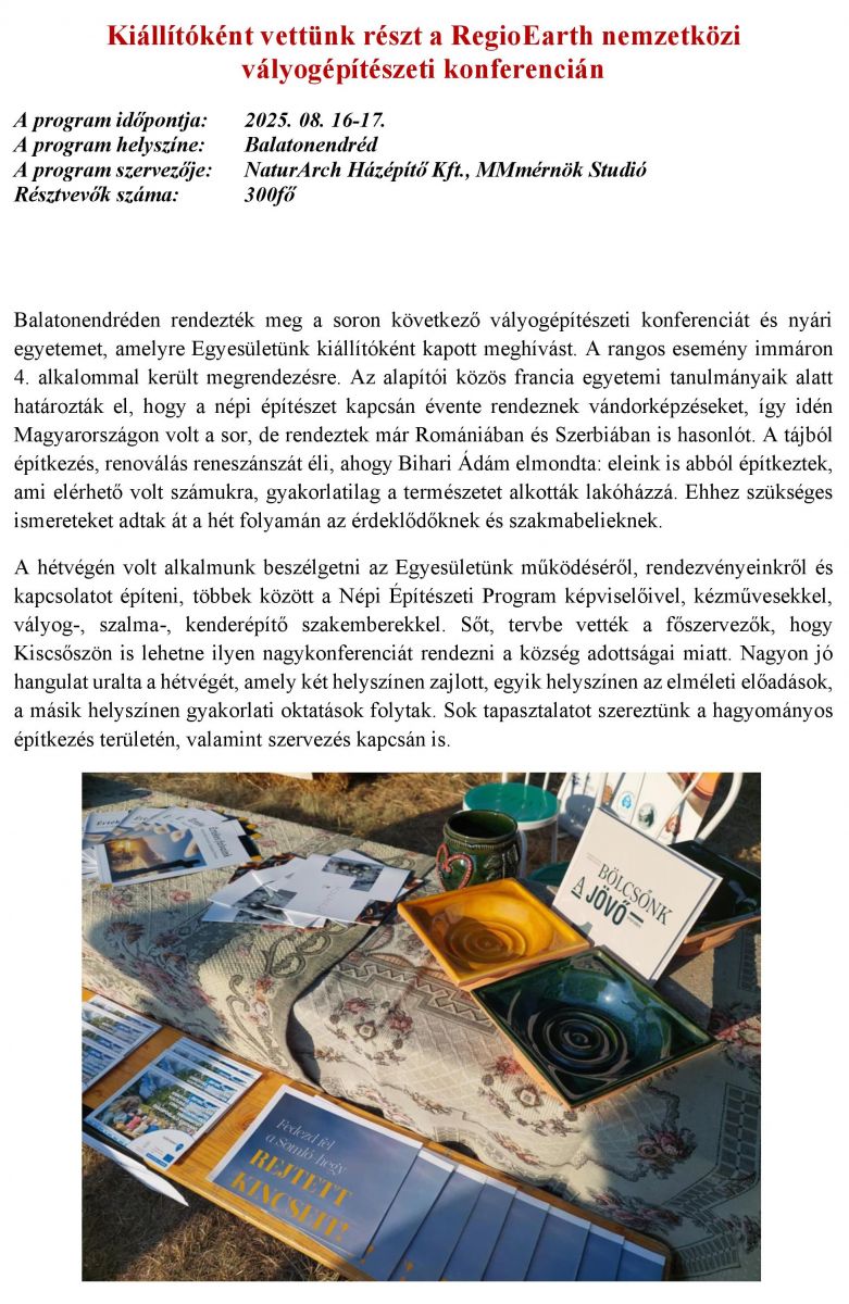Kiállítóként vettünk részt a RegioEarth nemzetközi vályogépítészeti konferencián