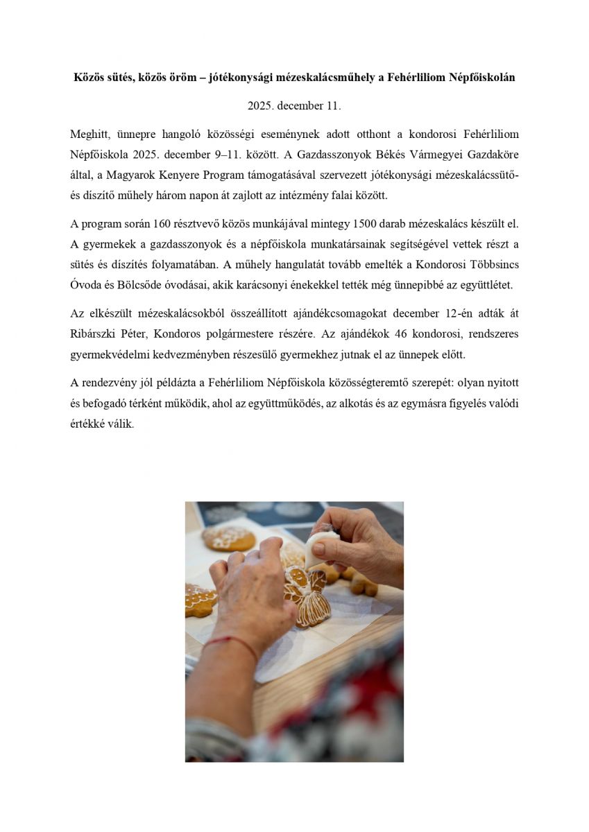 Közös sütés, közös öröm – jótékonysági mézeskalácsműhely a Fehérliliom Népfőiskolán