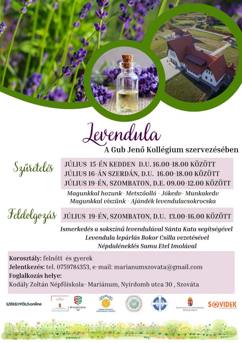 Sok szeretettel várunk mindenkit a Kodály Zoltán Népfőiskolára, a Mariánum házhoz, ahol július 15-én kedden délután, 16-án szerdán délután és 19-én szombaton délelőtt is levendula szüreteléssel készülünk a szombat délutáni feldolgozásra. A levendula szedésben segítkezőket megajándékozzuk egy levendulacsokrocskával. Amennyiben van, a metszőolló se maradjon otthon!