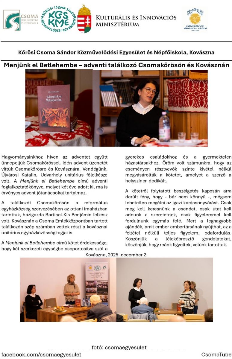 Menjünk el Betlehembe – adventi találkozó Csomakőrösön és Kovásznán