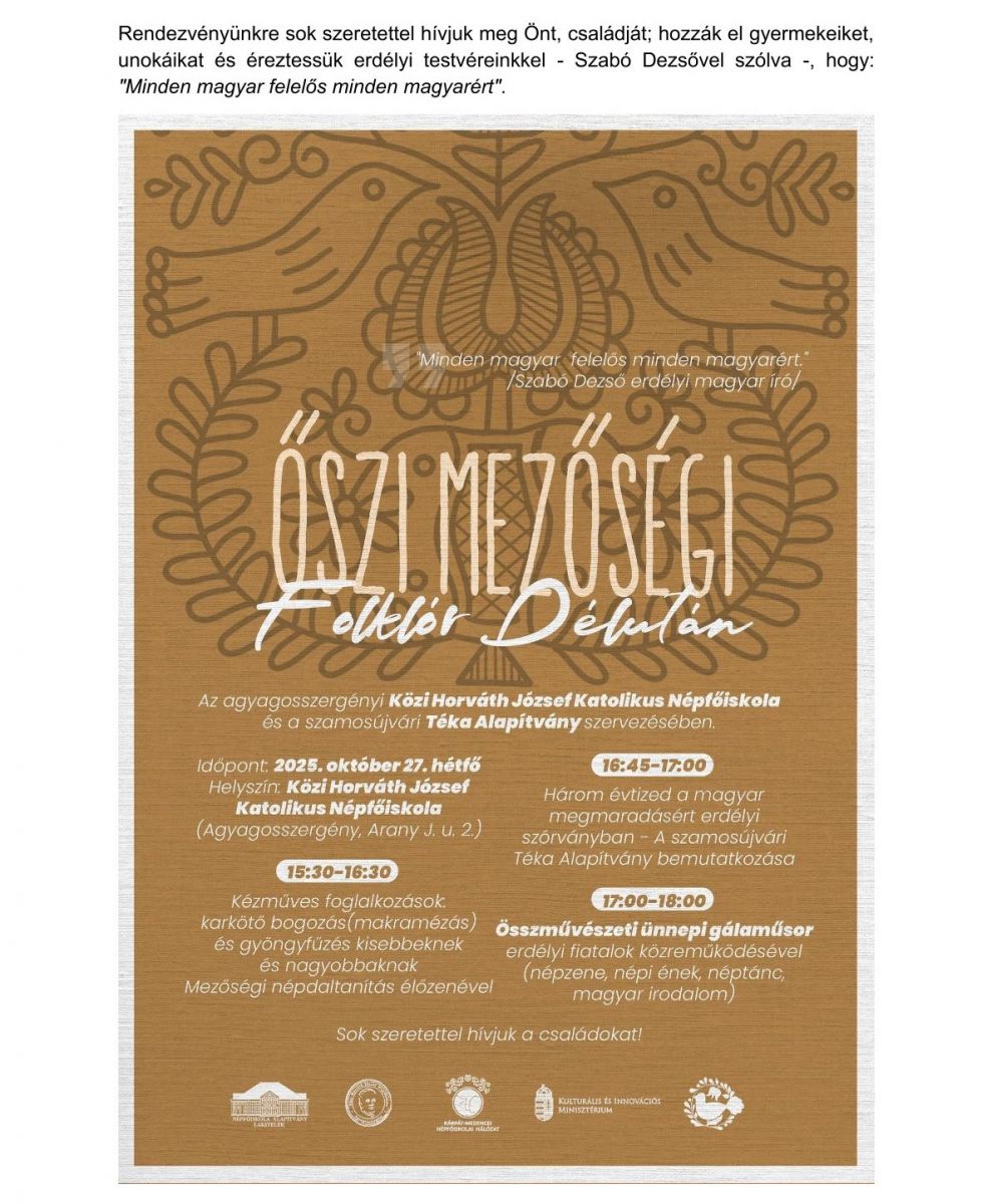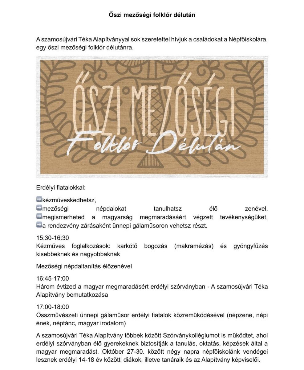 A szamosújvári Téka Alapítvánnyal sok szeretettel hívjuk a családokat a Népfőiskolára, egy őszi mezőségi folklór délutánra.