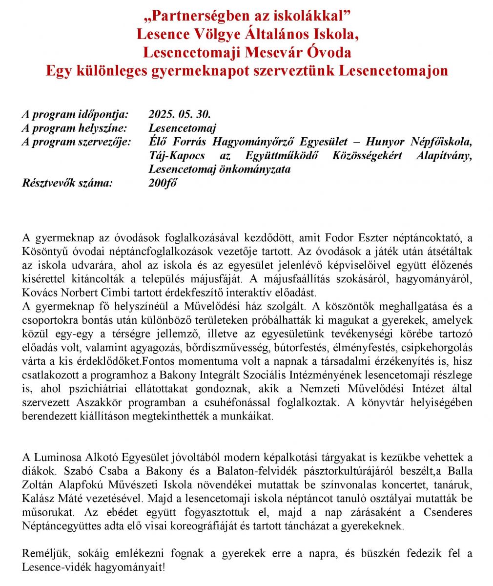 ,,Partnerségben az iskolákkal” Lesence Völgye Általános Iskola, Lesencetomaji Mesevár Óvoda Egy különleges gyermeknapot szerveztünk Lesencetomajon