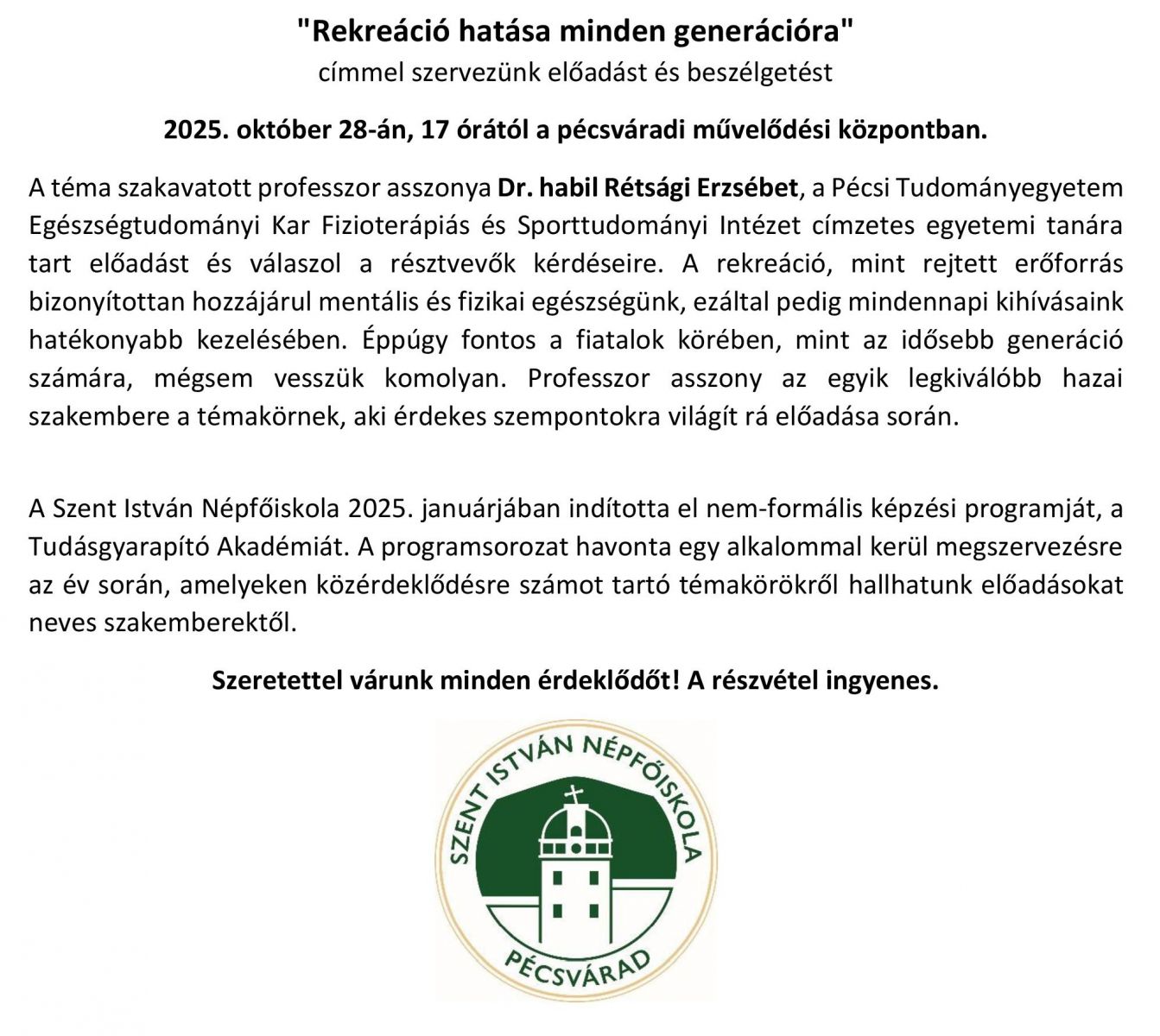 "Rekreáció hatása minden generációra" címmel szervezünk előadást és beszélgetést