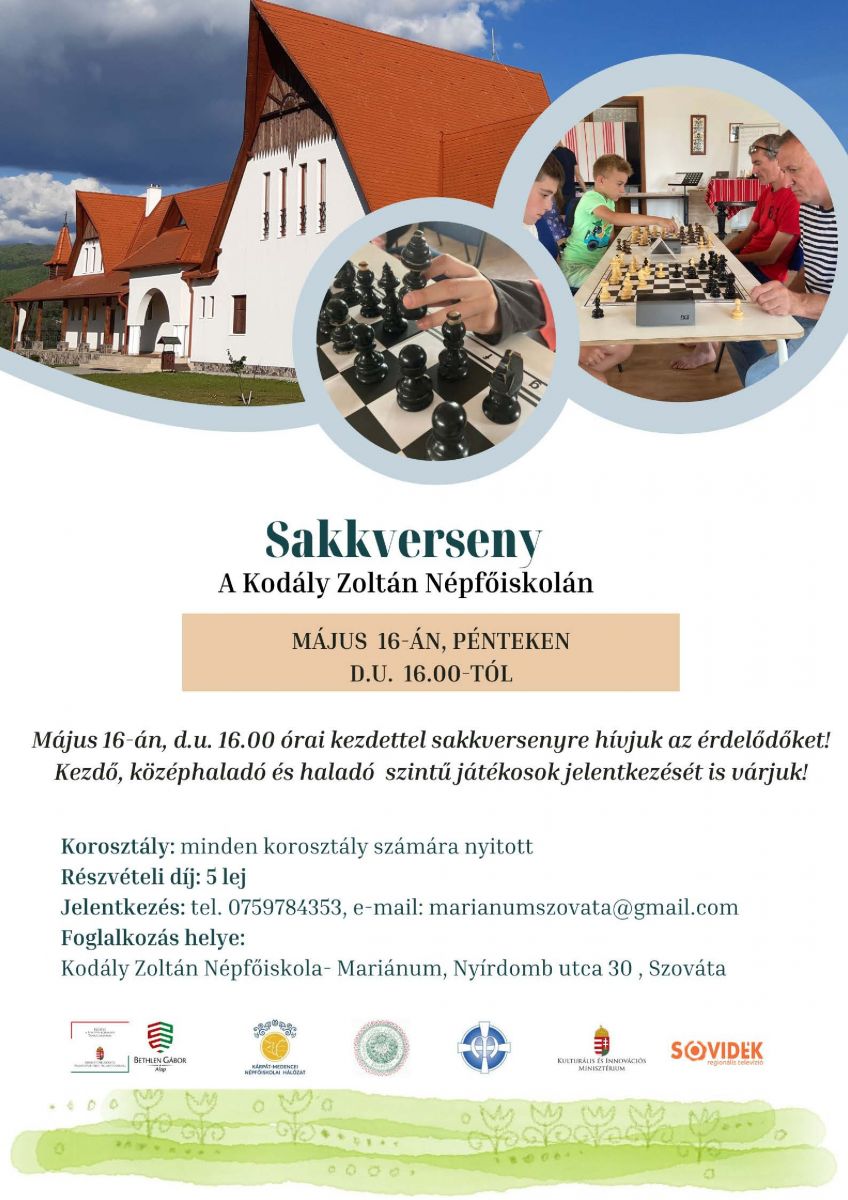 Második alkalommal szervezzük meg a Kodály Zoltán Népfőiskolán a minden korosztály számára nyitott sakkversenyt. Május 16-án, pénteken 16.00 órakor sok szeretettel várunk kicsiket és nagyokat egyaránt, akik szeretnék összemérni sakk - tudásukat.