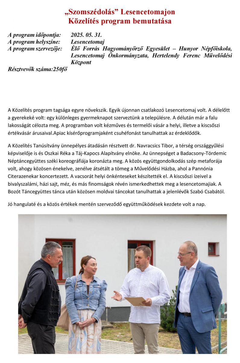 „Szomszédolás” Lesencetomajon Közelítés program bemutatása