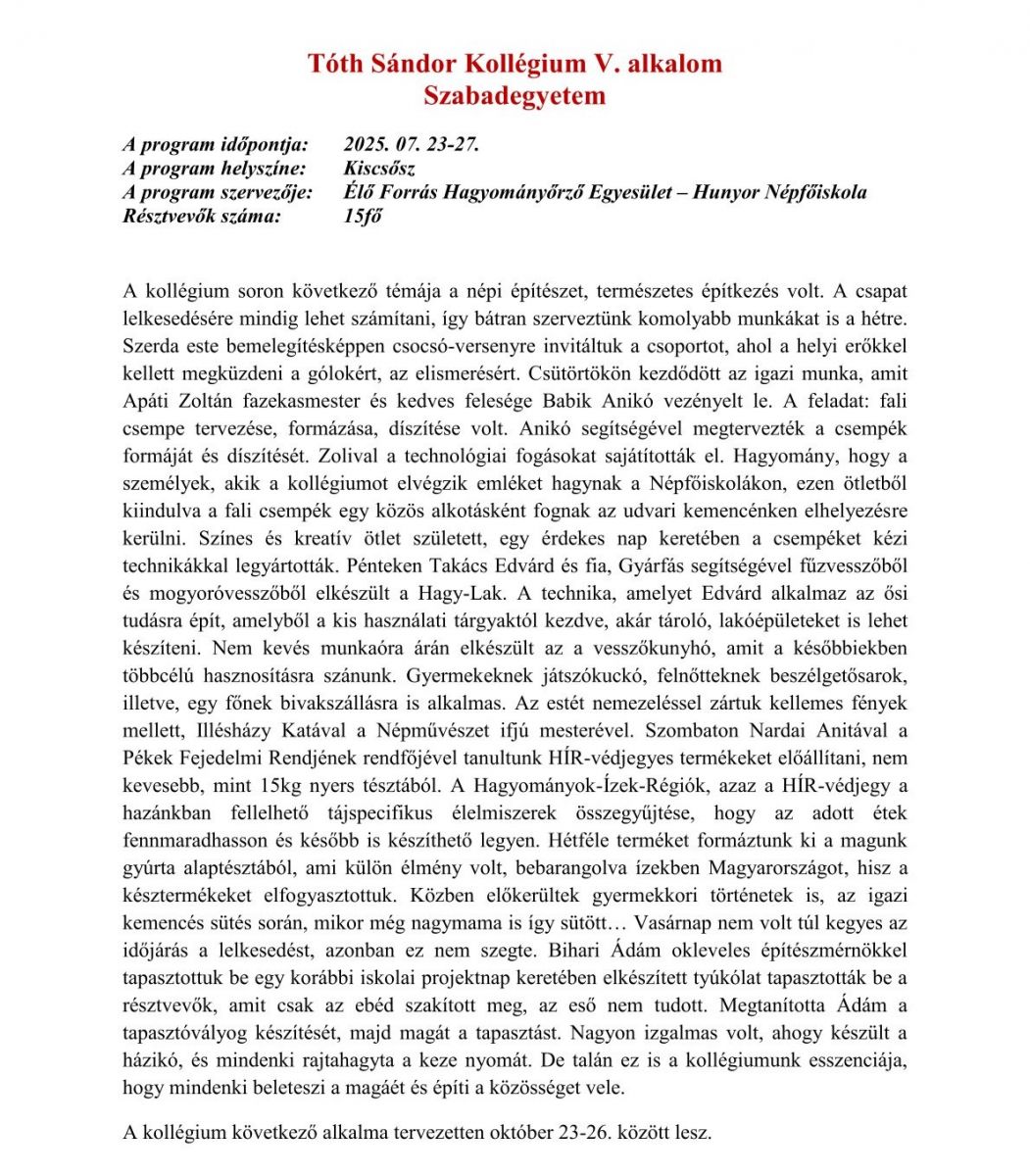 Tóth Sándor Kollégium nyári szabadegyetem