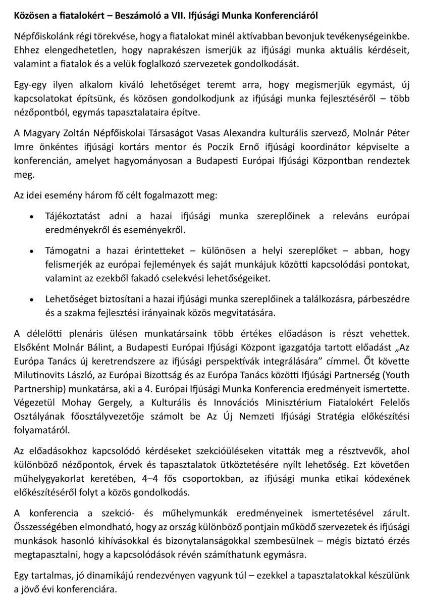 További információért látogassanak el a mezőörsi Magyar Műhely Közhasznú Alapítvány - gr. Széchenyi István Népfőiskola honlapjára.
