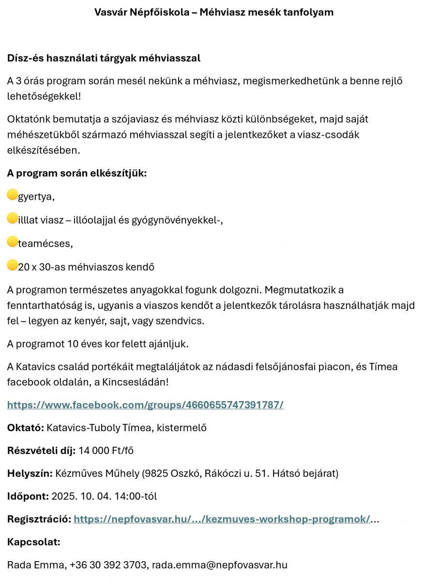 Vasvár Népfőiskola – Méhviasz mesék tanfolyam